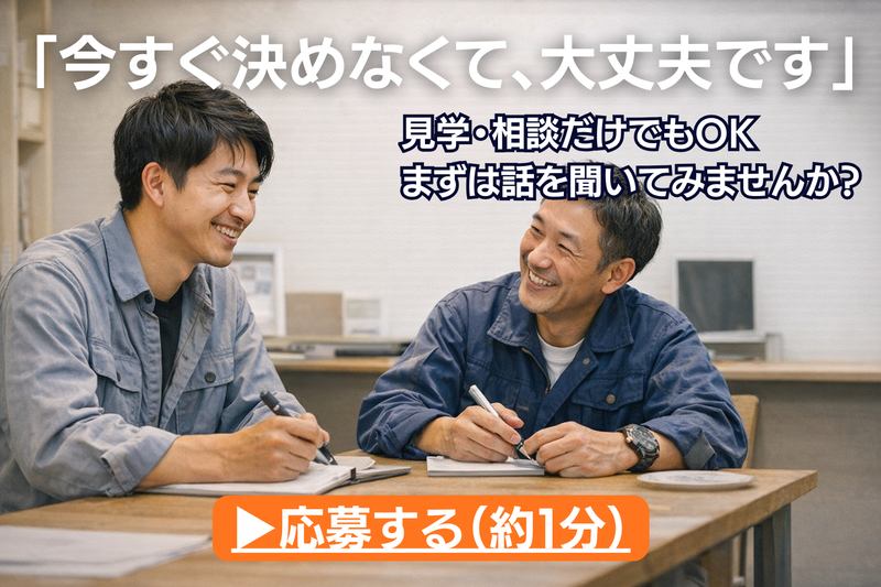 求めている人材 学歴や前職は問いません。 これまで何をしてきたかより、現場でどう向き合うかを大切にしています。 応募前に、職場の雰囲気や一緒に働く人を見てから決めたい、という方も歓迎です。 見学や来社のご相談にも対応しています! 「まずは話を聞いてみたい」 「自分にこの仕事が合うか確かめたい」 そんな気持ちから始めた先輩もいます。 無理に決めなくて大丈夫です。 一歩目として、気軽に声をかけてください。 【こんな人にピッタリ】 ✓周りを見て動ける人 ✓わからない時に、素直に聞ける人 「ここ確認していいですか?」と声を出せることが、 安全にもチームにもつながります。 ✓気づいたことを言葉にできる人 危険や違和感をそのままにせず、 小さな声かけで現場を整えていける人。 ✓未経験でも、手順を覚える努力ができる 道具の名前、一日の流れ、基本の動き。 最初はそこから一緒に積み上げていきます。 【歓迎条件】 管理職経験者・職長経験者・業界経験者・有資格者