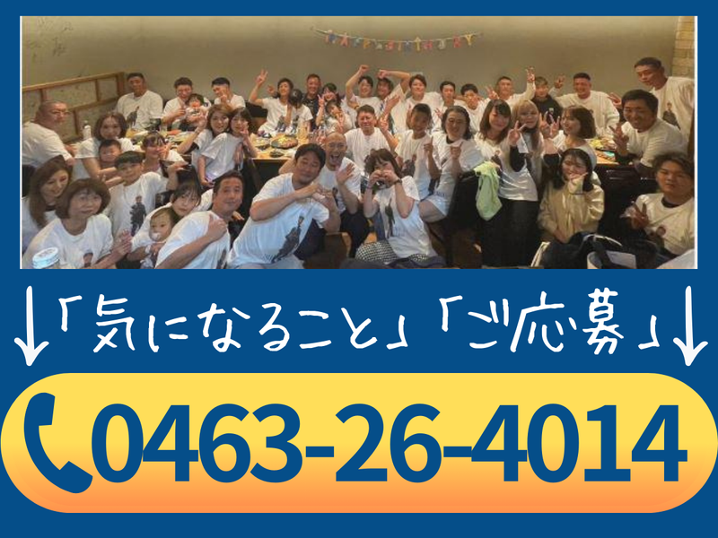 選考プロセス 【電話応募の方】 「社員募集の求人を見た」と伝えてください。 【問い合わせ電話番号】 TEL:0463-26-4014 【WEB応募の方】 応募ボタンより 必要事項を入力の上、送信してください。 こちらよりメール、もしくはお電話にてご連絡します! 【選考フロー】 書類応募(履歴書持参) ▼ 面接1回(海老名店にて実施予定) ▼ 採用合否