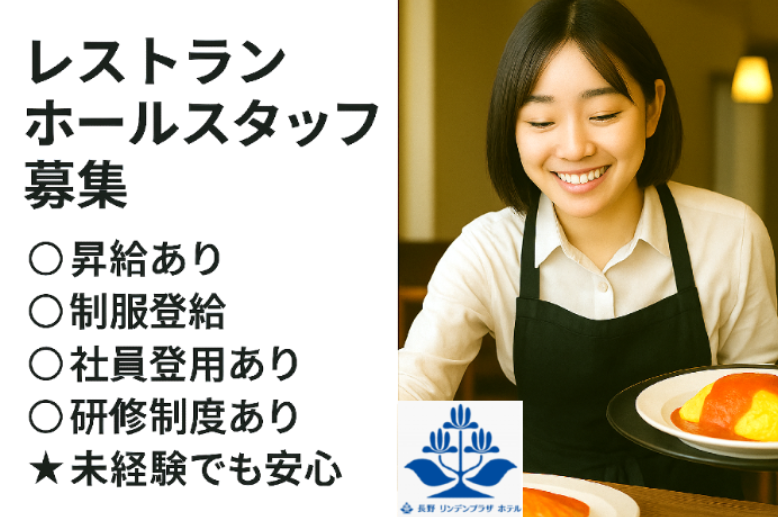 仕事内容 【未経験歓迎】安心の研修でしっかりとお仕事を覚えられます◎ 長野リンデンプラザホテル|レストランホールスタッフ募集 社員登用あり 昇給あり 時給1,100円~ 雇用形態:パートアルバイト ※勤務地は「長野リンデンプラザホテル」もしくは「たびのホテルlit松本」のいずれかとなります。 【主な業務内容】 ホテルレストランホール業務 お食事配膳、食器片づけ、テーブル案内、料理盛り付けなど ホテルレストランに関わる業務全般を担当していただきます。 【勤務】 早朝5:30〜9:30 シフト制(希望があればご相談ください) 【給与】 時給:1,100円〜1,200円 ※経験・スキルによって決定/昇給あり/社員登用あり 残業手当あり 【社会保険】 各種社会保険完備(健康保険/厚生年金/雇用保険/労災保険) 【福利厚生】 昇給あり 制服貸与 社会保険あり 残業手当 交通費規定支給(月額支給上限 40,000円) ★試用期間:3ヶ月(条件は本採用と同一) ☆★☆☆★☆☆★☆☆★☆☆★☆☆★☆☆★ ◎ホテル業界に興味があり、積極的にチャレンジしたい方 ◎接客・サービスを通じて誰かの役に立ちたい方 ◎マルチタスクに抵抗のない方、変化を楽しめる方 ◎未経験でも安心の環境でスタートしたい方 ☆これらが当てはまる方は 自信をもって当社で活躍して頂けます♫ ☆異業種からの転職者も多数活躍中です! ☆★☆☆★☆☆★☆☆★☆☆★☆☆★☆☆★ 【サンフロンティアグループについて】 1999年に東証一部(現プライム)に上場後、安定した業績を重ね成長を続けてまいりました。 お客様目線の細やかなサービスで、「また来たい」と思わせるおもてなしの心は、国内外から高く評価されています。 お客様と仲間のために心から尽くす『利他』の心を軸に、今後も事業拡大、成長を続ける将来性のあるグループです。 【応募の流れ】 応募→書類選考→面接 およそ2週間 応募ボタンよりエントリーまたはお電話 担当者よりご連絡します。 ☆面接当日にご体調がすぐれない場合は、ご無理をなさらずに面接日変更のご連絡をお願い致します。 ☆★☆☆★☆☆★☆☆★☆☆★☆☆★☆★☆ ◎未経験の方でも、安心の研修制度があるためご安心ください。 助け合い仲間のために働く社風です。若手、ベテラン問わず良い意見をどんどん賞賛し、推進する経営ポリシーがあるため、向上心があり、ホスピタリティ精神に溢れた従業員が多く活躍しています! ☆★☆職場の一つ一つの改善点を、あなたの持つ長所で大きな伸びしろに変えてみませんか? ☆★☆お客様の「ありがとう」の言葉を頂くために、共に一生懸命に働いてみませんか? ◎◎他にはない、あなただけの強みを当グループホテルで発揮して頂く事、尽くすことで得られる喜びを感じ、日々成長し、豊かになっていける事を強く願っております。 ※勤務地は「長野リンデンプラザホテル」もしくは「たびのホテルlit松本」のいずれかとなります。