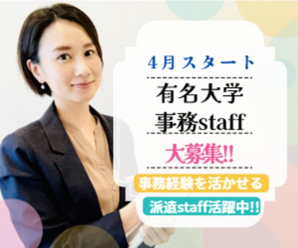 仕事内容  ̄ ̄ ̄ ̄ ̄ ̄ ̄ ̄ ̄ ̄ ̄ ̄ ̄ ✨ 業務についての詳細 ✨ _____________ ⭐4月スタート⭐ 私立大学の国際関係学部事務室でのサポート事務のお仕事! 学生や保護者対応がメインの部署です◎ 【具体的には…】 【事務室補助業務】 ・海外留学管理業務 ・現地研修補助業務 ・文部科学省への認可申請手続き業務 ・窓口 対応業務(学生・教員・卒業生・外来者等対応) ・履修・成績関連、ガイダンス関連、試験関係業務補助(授業中試験・定期試験・追試験) ・伝票処理 ・その他学部事務室関係業務補助 専任の職員さんもおり、チームでお仕事をしていただきますので、安心してお仕事スタートできます◎ // この求人のPOINT // ❖ 残業はほとんどナシ!  ̄ ̄ ̄ ̄ ̄ ̄ ̄ ̄ ̄ ̄ ̄ ̄ 基本的に定時で上がれるので、家事や子育てと両立したい方にもぴったり! スタッフからは「子どもが帰るまでにご飯の準備ができて助かる!」などの声も頂いています。 ❖ 30代~50代が活躍中!  ̄ ̄ ̄ ̄ ̄ ̄ ̄ ̄ ̄ ̄ ̄ ̄ 主に、30~50代のスタッフさんが中心となって活躍しています! お仕事はしっかりと教えてもらえるので、ブランクがある方も安心してスタートできますよ✧