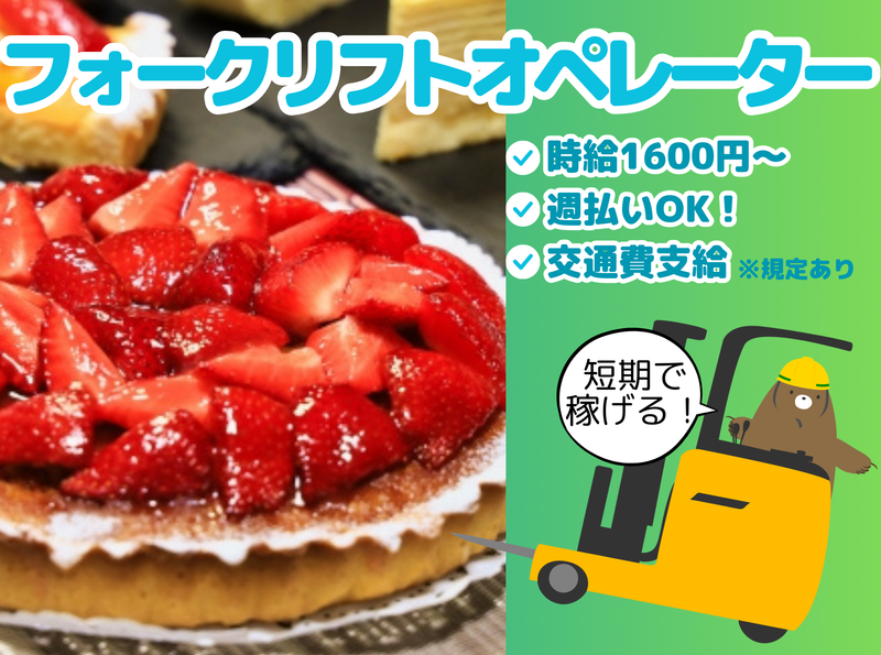 仕事内容 冷凍スイーツを扱う倉庫内で、フォークリフトを使用した入庫作業をお任せします! 具体的には・・・ ・商品の積み下ろし・運搬作業 ・入庫した商品の 棚入れや整理整頓 ・出荷指示に基づいた ピッキング・仕分け作業 ※フォークリフト作業以外に、簡単な出庫準備作業 も一部担当していただく可能性があります ★勤務期間は即日~年末まで ◆高時給でしっかり稼げる◆ 高時給1600円!残業代も含むと月給30万円可能! 週払いも可能♪短期間でしっかり稼げます↑↑ ◆清潔で作業しやすい環境でお仕事もスムーズ♪◆ 食品を扱う倉庫なので、綺麗で清潔な環境で働けます。幅広い年代の男女が活躍中!和気あいあいとした雰囲気です♪ ◆通勤しやすい&手当充実◆ JR「伊丹駅」から自転車で5分、バス停から徒歩3分とアクセス良好。バイク・自転車通勤もOKで、交通費も支給されるので安心して働けます◎ ーお問い合わせ先についてー お電話でもご応募を受け付けています。 またこちらのお仕事のご応募以外にもあなたにピッタリのお仕事探しのお手伝いをさせていただきます! お気軽にお問い合わせください♪ 担当TEL:090-6954-1445