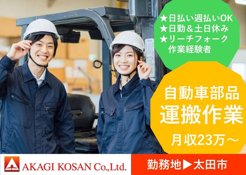 仕事内容 【月収23万円~】【フォークリフト技能講習修了者】 勤務地は太田市内の自動車部品製造工場 フォークリフト作業(派遣社員)のお仕事です! 倉庫にて自動車部品の運搬作業をお願いします。 *フォークリフト技能講習修了者 *リーチフォーク作業経験者 倉庫・製造・工場のお仕事を探している方、是非ご応募ください。 ここがおすすめポイント ・日勤で残業は繁忙期のみ!安心して働けます ・土日休みでプライベート充実 こんな方は派遣社員に向いている?! ・他業種からの転職を考えているけど何がいいか自分でわからない ・とりあえずつなぎの仕事が欲しい ・仕事以外にやりたいことがある(でも収入は欲しい) ・パート、アルバイト時給より稼ぎたい方 ・正社員を目指しているけどなかなか良い仕事に巡り合わない方 (とりあえず派遣社員という選択肢もあり!) 私たち赤城工産にぜひご相談ください ・人材サービス歴25年以上!群馬、栃木、埼玉のお仕事探しはおまかせください! ・地元のお仕事案件多数あり!長期派遣のお仕事はほぼ全て正社員登用ありのお仕事です! ・日払い、週払い、前払いに定評あり!