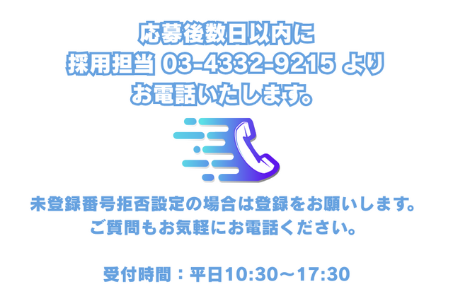 応募後のプロセス ご応募 ↓ ①電話での事前確認 ②書類選考・面接 ↓ 採用 応募方法 下記応募フォームからご応募ください。 応募受付後、ご登録いただいた電話番号宛に 株式会社インジェスター採用担当 【 0343329215 】 からお電話をいたします。 ◆電話帳未登録番号からの着信を拒否 等の設定をしている場合は上記番号をご登録お願いいたします。 ご質問等ございましたらお電話ください。 ※こちらは応募者様専用の番号になっております。 企業様からの営業等のお電話はご遠慮ください。