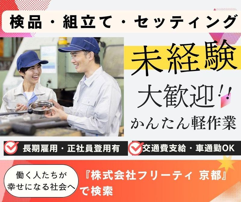 仕事内容 車部品・医療機器・家電機器などに使用する軽量プラスチックの検査・組み立て・セッティングなどの製造工程を分担した作業をお任せします!✨ 【具体的には】※作業工程は3種類あり、希望の持ち場に就くことができます。 全てシンプル作業✨ ✅①検査工程作業。医療機器や家電などで使われるプラスチック部品を一つひとつ確認し検査を行う作業! ✅②組み立てや取り付けなどの製造工程を行う作業。簡単な軽作業ですので未経験の方でも安心してスタートできます。 ✅③セッティング業務!決まった金属の金型にプラスチックの部品をセッティングしていく作業です! 重量物などは無く、手のひらサイズの軽量プラスチックになります。 まずは、できる範囲内でお任せしますので、ゆったり安心してスタートできます✨ ※初めての方でもすぐに初められるシンプルで簡単な作業!!✨ == 入社後は == まずは簡単な業務から! 先輩に教えてもらいながら簡単な補助業務から覚えていけばOKです! 先輩の補助業務を通して流れを身に付けていきしょう!