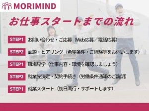 選考手順 ◆WEB応募の場合 「応募する」ボタンからご応募下さい。24時間いつでもOK!応募情報のみの入力でかまいません。 ◆電話応募はさらにカンタン 応募受付TEL 0228-24-8447 (月~金/午前8:30~午後6:75) ※祝日可 ◎担当者からのメッセージ 「ここまでお読みくださりありがとうございます。担当コーディネーターの佐藤です。 『もう少し詳細が聞きたい』 『他にも応募しているけど大丈夫かな…』 『職場を見てみたいな!』 など、少しでもご興味を持っていただけましたらお気軽にご連絡ください。 皆さんのご要望やお仕事する上での条件など丁寧にお聞きします。職場の雰囲気や上司の人柄、スタッフの年齢層など、気になることは確認してお伝えします。面接から、職場見学、出勤初日まで同行します。安心しておまかせください!」 面接地 ◆株式会社モリマインド 宮城県栗原市築館青野8-10 TEL 0228-24-8447 ◆岩手県内での出張面接・WEB面接も行っております お気軽にご相談ください