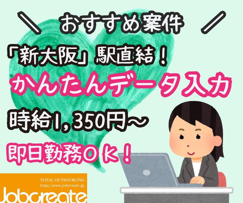 仕事内容 No.62550 ****************** \今CMで有名なあの大手企業でのお仕事/ キレイなオフィスでのカンタンデータ入力作業 駅直結なので雨に濡れる心配なく通勤らくらく♪ ****************** パソコンが得意じゃなくても ぜーんぜん大丈夫です♪ 名刺の情報を専用のシステムに データ入力するだけ! ▼入力する内容▼ ・会社名 ・住所 ・氏名 ・アドレス 入力担当が振り分けられているので、 焦ることなく、自分のペースで作業できます! 電話対応も一切ないので、 モクモク作業・データ入力がすきな方にはピッタリ♪ Excel・PCスキル一切必要ないです! ※タイピングスピードのチェックあります。 ☆アピールポイント☆ ・キレイなオフィスで快適! ・電話対応なしのデータ入力♪ ・嬉しい土日祝休み ◇職場環境◇ 冷暖房完備の環境 座り仕事 服装自由 20代~40代の男女の方が多く活躍中♪ わからないことは気軽に聞けるので、 未経験でも安心! ◇勤務形態◇ 【時間】 ①7:00~15:30 (休憩時間11:45~12:30) ②9:00~17:30 (休憩時間11:45~12:30) ③12:30~21:00 (休憩時間17:30~18:15) 休憩:45分 実働:7.75時間 残業:10~20時間程度/月 定時後、30分休憩してから 作業開始していただきます。 ①~③のシフト制になります。 (③時間対応必須) 【休日】 土日祝(会社カレンダー) ◇月収例◇ 1,350円×7.75H×20日 =209,250円+交通費全額支給 ◇交通費◇ 実費全額支給 ◇アクセス◇ 「JR新大阪駅北口」徒歩約7分 「地下鉄御堂筋線新大阪駅4番出口」徒歩約3分 **-** ジョブクリエイトは 大阪府高槻市にある派遣会社です。 製造、倉庫内、梱包などの軽作業はもちろん オフィスワークや販売促進など 豊富な人材サポートを行っております! 阪急高槻市駅から歩いて3分♪ 来社不要のWEB面談も実施しております! ご希望の方はお気軽にお申し付けください☆ **-** <自宅から面接ができるWEB面接実施中> 来社不要のスマホ面接もございます! ご自身のPCやスマホでご自宅からかんたんに面接♪ ▽WEB面接についてはこちら WEB面接は誰でも出来ますか? <apアプリポイントプレゼント!> 日々のお仕事でポイントがたまり、 日用品や家電、食品、旅行券などの 商品と交換していただけます! ▽apアプリについてはこちら 社内連絡専用メッセンジャーアプリについて ※土日祝日に頂いたご応募に関しましては、 翌営業日に順次対応させていただきます。 **-**