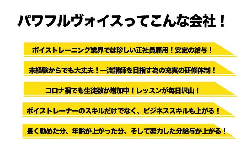 仕事内容 ●講師 (話す声のボイストレーナー) 生徒さんに話す為のボイストレーニングを行い、生徒さんが声・コミュニケーションを通して社会で活躍されていく為のお手伝いをして頂きます。 生徒さんの年齢層は30~40代を中心に、下は3歳から上は80代の方まで。職業もビジネスマン、OL、政治家、医師、弁護士、経営者、学生、俳優、声優、ナレーター等、様々です。 当校の培ってきたノウハウを学んで頂きますので未経験の方でも安心して講師になって頂けます。 ●講師 (歌のボイストレーナー) ボイストレーニングを行い、歌を通して人生を豊かにして頂く為のお手伝いをして頂きます。 生徒さんは3歳~80代の幅広い年齢層、そして趣味からプロ志望まで様々な目的の方が通われています。 当校の培ってきたノウハウを学んで頂きますので未経験の方でも安心して講師になって頂けます。 ●受付事務 スクールの顔として生徒さんへの応対、時にはアドバイザーをしてご相談に応じ、生徒さんに気持ちよくスクールに通って頂けるよう対応して頂きます。 また、スクールの運営業務にも携わって頂きます。 希望者は、受付での経験・研修を積んで、講師になることも可能です。 ※すべての職種において、途中入社によるハンデ、年齢・性別によるハンデはありません。