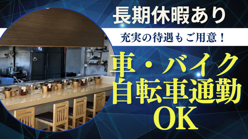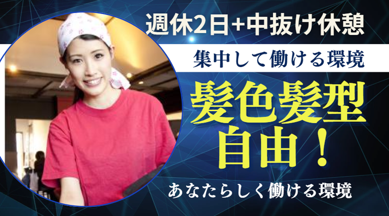 【保険制度】 雇用保険、労災保険、健康保険、厚生年金 待遇・福利厚生 【福利厚生】 ◆交通費規定内支給 ◆車・バイク・自転車通勤OK ◆まかないあり ◆制服貸与 ◆髪型・髪色自由