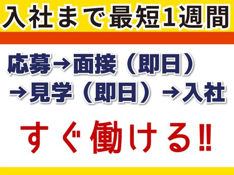 【保険制度】 雇用保険、労災保険、健康保険、厚生年金 待遇・福利厚生 【福利厚生】 *社会保険完備 *交通費規定支給 *制服貸与(着たまま通勤OK) *車・バイク通勤OK *駐車場完備(駐車場から作業場まで徒歩1分以内) *研修制度あり *有給休暇あり *慶弔休暇あり *健康診断あり *退職金制度あり *休憩室あり *飲食スペースあり *電子決済の無人売店あり(アイス、カップ麺、レトルトカレー、お菓子など) *近くにコンビニあり *仕出し弁当の注文OK(1食450円~500円) *自動販売機あり *個人ロッカー完備 *週払いOK(規定) ⇒申請すれば毎週月曜日が給料日に!