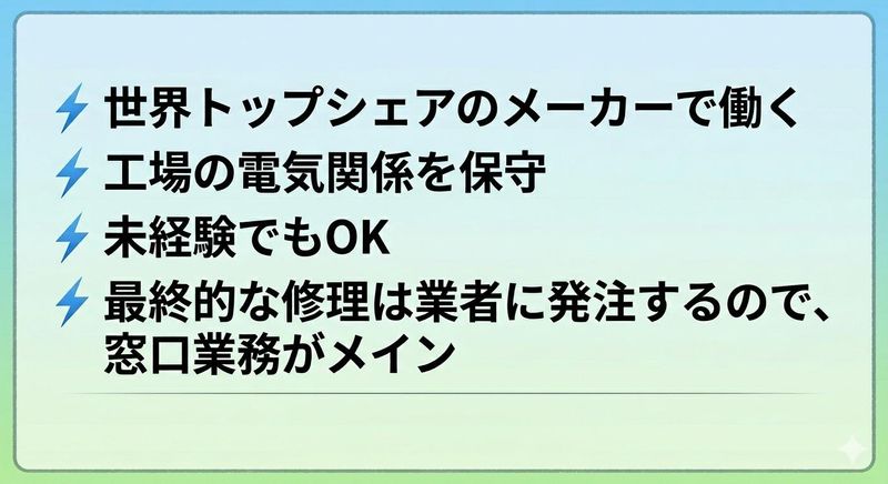 仕事内容 世界トップクラスのシェアを誇る基盤メーカーの工場でのお仕事です。 高度な技術力でデジタル社会の基盤を支えており、安定感は抜群。 落ち着いた環境で、専門資格を活かして長く働きたい方に最適な職場です。 総務部での勤務となるため、現場の「モノづくり」を支えるお仕事になります。 各工場の電気関係の点検業務をメインに保守業務を担当して頂きます。 【御殿場市】電気主任技術者(第3種)募集|月収40万円以上可|残業ほぼなし|将来的な正社員登用あり! ■ 仕事の内容 御殿場工場を拠点とし、各工場の電気設備および施設管理の維持・保守業務をお任せします。 「資格はあるけれど、実務経験が浅くて不安…」という方もご安心ください。 専門的な修理は外部業者へ依頼するため、基本的には点検と業者への橋渡し(窓口業務)がメインとなります。 【具体的な業務】 ●電気設備管理: 日常点検、月次点検業務(※年次点検は外部専門業者が実施します) ●施設メンテナンス: 設備故障時の一次対応、消耗品の交換、不具合箇所の確認 ●業者手配・窓口: 専門知識を要する修理が必要な際、専門業者への見積依頼や作業立ち会い、監督業務 ●巡回点検: 月に1回程度、相模原・横浜・御殿場の別工場への訪問点検(基本的に御殿場工場に常駐となります) ■ このお仕事のポイント ●手厚い引き継ぎ体制: ベテラン社員から、最大3ヶ月間(5月入社の場合)の丁寧な引き継ぎ期間を設けています。 ●ワークライフバランス充実: 残業は基本的にありません。定時退社が可能なため、プライベートの時間もしっかり確保できます。 ●正社員登用のチャンスあり: まずは派遣からスタートし、職場環境に慣れていただいた後は正社員として活躍いただくことも視野に入れています。