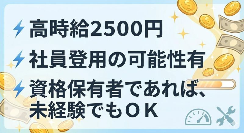 求めている人材 ●必須資格:第3種電気主任技術者(電験三種) ●自動車運転免許 ●第1種・第2種をお持ちの方ももちろん歓迎します。 ●試験合格のみ(実務未経験)の方も、意欲があれば歓迎いたします!