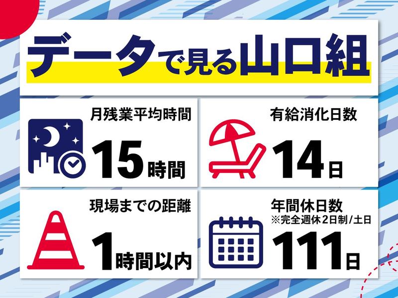 仕事内容 \ 後世に残る、人に自慢できる仕事! / 20~60代まで 幅広く活躍中!活気ある職場 ~子育て中パパさん多数!働きやすさ抜群~ 家族時間を増やしたい、収入は減りたくない が叶う会社!<長期的なキャリア形成応援> +給与は経験や成果などの、頑張りを考慮! +出張なし&原則定時退社!家庭と両立も可 +単身用・世帯用寮完備&家族手当も充実! -------------------- 【仕事内容】 現場代理人として工事の工程管理をお任せ! ※現場は秩父市本社から車で1時間以内のみ 【具体的に】 *写真撮影・測量・図面や資料の作成 *発注者との打ち合わせ …など! ゆくゆくは新人育成にも挑戦できます! <現場従事者について> 当社内やグループ会社のスタッフがメインで よく知る顔が多く、指示出しも超スムーズ! <最新技術導入> 「ICT(情報通信技術)」の積極的な活用により 時間や人手などコストがかかっていた測量を ドローンや地上レーザースキャナーで対応! コスト削減&働き方改革にも積極取組み中! -------------------- \活躍ポイント!官公庁案件中心で安定!/ <土木工事> 急カーブが多く細い国道にトンネルを通して 危険な道を回避できるようにする土木工事! <河川工事> 堆積した土砂を取り除き、洪水災害を防ぐ! <道路工事> ひび割れや隆起した道路を敷き直すことで、 快適になるだけではなく、交通事故も防止! -------------------- [(株)山口組*HP]https://yg1937.com/