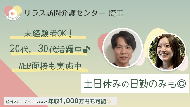 仕事内容 【▼まずは訪問介護の現場を知ることからスタート!▼】 入社後すぐは、介護の最前線である訪問介護の現場で経験を積んでいただきます。 利用者様一人ひとりに寄り添い、信頼関係を築きながら、 介護の基礎と仕事の流れを学んでいきましょう。 丁寧なOJT研修と先輩スタッフの同行があるので、未経験の方もご安心ください。 ● 身体介護(食事、入浴、排せつなどの介助) ● 生活援助(洗濯、掃除、買い物代行など) ● 見守り、体位交換 など ※ 無資格の場合、資格取得までは有資格者が必ず同行します。 ※ 先輩ヘルパーとの同行研修で、安心して業務を始められます。 ※ ヘルパーさんのご自宅から利用者様のお宅へは直行直帰が可能です。 【▼将来的にお任せする管理・マネジメント業務▼】 現場での経験を十分に積んだ後、少しずつ以下の管理者業務をお任せしていきます。 あなたのペースに合わせて丁寧に指導しますので、着実にステップアップできます。 ● スタッフのシフト管理 ● 人材育成(新人スタッフへの指導や研修など) ● ヘルパーへの指導(利用者様のケアプランに合わせたケア内容の指示など) ※業務変更なし ※転勤なし 【▼「リラス訪問介護センター」をご紹介します!▼】 利用者様が住み慣れた場所で安心して生活できるよう、 ご自宅へ訪問し、お一人おひとりの自立に向けた介護ケアを行っています。 地域と密に関わり、介護を必要とする方にきめ細かいサービスを提供することで、 地域社会への貢献を目指しています。 【▼未経験からでも安心して成長できる体制です▼】 充実の研修制度 お仕事スタート時は先輩との同行研修や丁寧なOJT指導を実施。 あなたの独り立ちまで、会社が責任をもってサポートします! 明確なキャリアパス 現場からスタートし、将来は事業所の中核を担う管理者へ。 あなたの成長意欲に応えるキャリアプランを用意しています。 ライフステージの変化に対応 育児目的休暇制度や介護休業制度も充実。 復職制度もあり、腰を据えて長く働きやすい環境です。 資格取得を全力で応援 会社負担で資格取得が可能(費用100%補助)。 働きながら専門スキルを身につけ、キャリアアップを目指せます。 ご利用者様に寄り添い、思いやりを持った対応ができる方、 この高齢化社会で貢献したいという意欲のある方のご応募をお待ちしています! 私たちと一緒に、地域の方々の暮らしを支えていきましょう!
