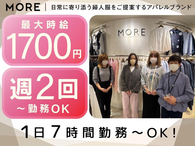 仕事内容 ┌――――――――-―┐ 求人のポイント └――― v ―――――┘ ⏩アパレルブランク歓迎 ⏩ノルマなし!OJT制度あり! ⏩横浜ジョイナス内の駅チカ店舗 ⏩週2日~1日7h~の勤務OK! ⏩高時給!19時以降時給1700円 【仕事内容】 アパレル販売のお仕事をお任せします。 具体的には・・・ ⭐接客 ⭐レジ ⭐店舗清掃 ⭐バックヤードの整理 など 【1日の流れ】 9:40 出勤/オープン前準備 10:00 開店/接客 13:00 お昼休憩 14:00 接客 19:00 退勤 お店は早番/遅番の1日3名~4名体制 現在スタッフ6名在籍しています◎ 【MOREについて】 シンプルで気心地のいい服が揃う 普段の何気ない日常をMOREの服を まとうことで気分がUPするそんな 洋服が揃っています。 【スタッフインタビュー】 40代主婦さん 入社2年目 子どもの手が離れ正社員のようにがっつり 働きたくアパレル復帰をしました。 高時給なのも魅力的です! 不安もありましたがOJT制度もあり 楽しくお仕事ができています! 「ありがとう」という一言がなによりも 嬉しいです! =================== ノルマなしの“丁寧な接客”を 大切にするお店です。 会話を楽しみながら働ける環境です◎ =================== 【横浜店について】 駅直結の商業ビルになるため たくさんのお客様がご来店されるお店◎ 1日●●名程度のお客様が来店します! スタッフ同士アイディアを出し合いながら お店作りをしていきます◎ こんな方にピッタリ! ✨洋服が好き ✨接客が好き・人と話すことが好き ✨好きなことを仕事にしたい 【こんな方におススメ】 ✨もともと接客業をしていて復帰したい ✨やっぱり洋服に囲まれて仕事がしたい ✨いずれは正社員を目指している ✨ある程度お金を稼ぎたい