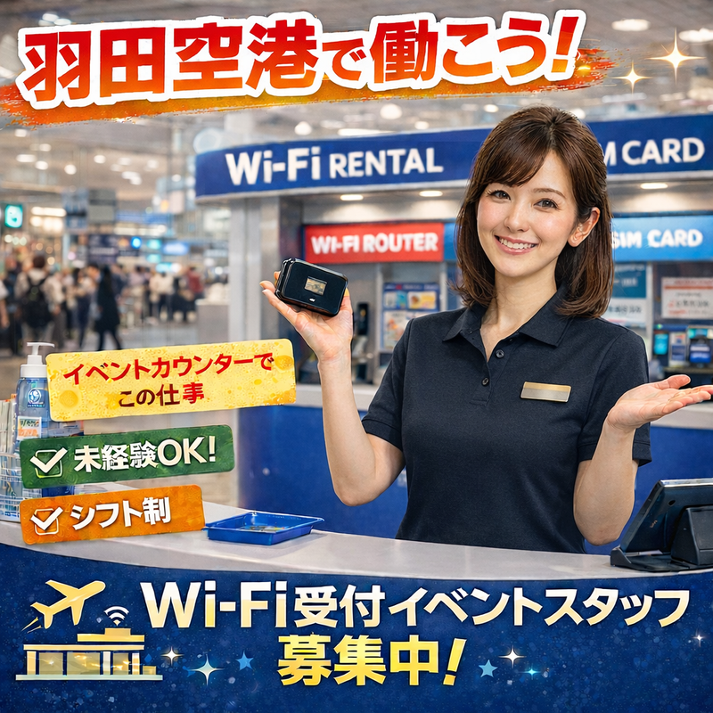 仕事内容 羽田空港で働けるレア求人! ポケットWi-Fiイベントカウンターでの簡単な受付対応のお仕事です。 英語力は一切不要! 笑顔に自信があれば未経験でも大歓迎です♪ ◆これから海外へ出国されるお客様へポケットWiFiの貸出 ◆データプランやオススメ商品のご案内 ◆シンプルな受付対応だから未経験でも安心!! ◆笑顔で対応できればOK♪ 日本人スタッフ多数就業中♪ 日本人のお客様対応が中心なので英語力不要! 《ここがポイント》 ◆高時給1.600円~でしっかり稼げる♪ ◆空港勤務で非日常を味わえる! ◆国際空港ならではのワクワク感(^^) ◆英語力不要!未経験からスタートできる☆ ◆日本語での接客がメインのため、語学力は必要ありません! ◆事前に職場見学OK(^^♪ ~未経験でも安心の理由は?~ ◆約1ヵ月間の丁寧なOJTでの研修がありますのでサポートもバッチリ! →1つ1つ自分のペースで覚えていけばOKです! ◆運営会社変更により新メンバーの大募集♪ ◆アナタも世界一綺麗な空港で働いてみませんか?? <勤務地> 羽田空港、第3ターミナル内 空港駅直結で通勤ラクラク♪