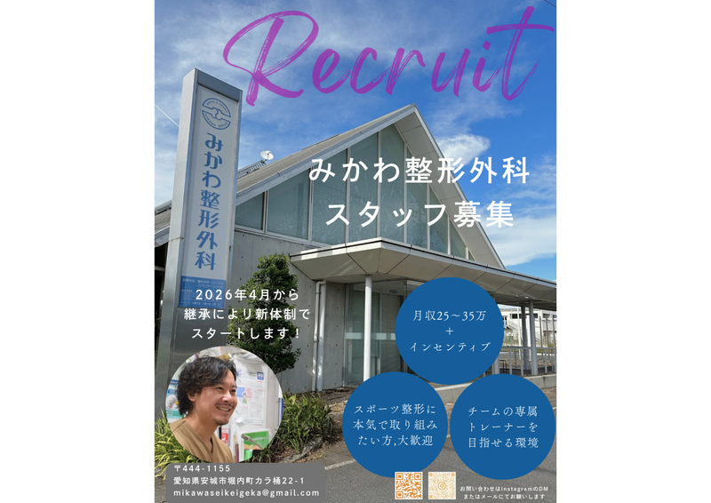 職場環境 令和8年4月より継承に伴い新しい体制で クリニックを再スタートします。 ▼ホームページもご覧ください! https://mikawa-seikei.com/ \ あなたからのご応募 / ― お待ちしています♪ ― / ご応募はお気軽に★ \ 喫煙所:なし(敷地内全て禁煙)