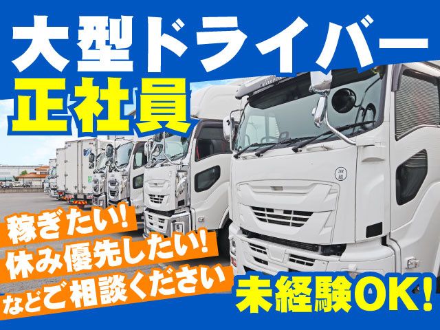 仕事内容 大型トラックでの配送業務をお任せします。 扱う荷物はパレット・ゲート・バラ積みなど多岐にわたりますが、入社後は先輩ドライバーが同乗して丁寧に指導します。実務経験がない方も、安心してプロのドライバーを目指せる環境です。 <ここがポイント!当社のメリット> ◆毎日帰宅可能! 長距離や泊まりの運行はないため、家族との時間も大切にできます。 ◆自分に合った働き方! 「しっかり稼ぎたい」「休みを重視したい」など、希望を考慮します。 ◆最新設備で安心! 全車にバックカメラ、ナビ、デジタコを完備。安全運転をサポートします。 ◆スキルアップを応援! 各種免許取得制度があり、働きながらステップアップが可能です。 ◆女性ドライバーも活躍中! 性別を問わず、幅広い層のスタッフが和気あいあいと働いています。 ◆未経験からスタートOK! 見習い期間は熟練の先輩が横乗りし、自信がつくまでサポートします。 「大型免許は持っているけれど、実務経験がなくて不安……」という方も心配いりません。当社の運行スケジュールに合わせながら、少しずつ業務に慣れていってください。 頑張った分は「歩合」として給与にしっかり還元されるので、モチベーションを維持しながら働けます。運行内容の詳細や具体的な働き方については、面談の際にお気軽にご相談ください。まずは一本、お電話をお待ちしております! 【会社より】 1999年5月設立の当社は群馬県内を主軸に輸送・倉庫業務をトータルで担って参りました。 物流業界での長年の経験と実績で、多くの取引先様からの信頼を得ており経済低迷が著しい昨今でも安定した業績を誇っています。
