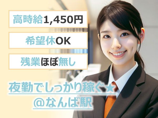 仕事内容 ・・━━・・━━・・━━・・━━・・━━・・ ✨未経験OK!※金銭の取扱い経験必須 ✨夜勤ありでしっかり稼げます 高時給1450円(月収26万程度可能) ✨英語力活かせる! 翻訳機の用意もあります♪ ✨残業ほとんどなし! ✨駅チカ:各線なんば駅からすぐ! ・・━━・・━━・・━━・・━━・・━━・・ ┏━━━━━━━━━━━━━┓ < お仕事内容 ┗━━━━━━━━━━━━━┛ 駅案内所でのチケット販売のお仕事です! 具体的には… *特急券、乗車券、定期券の販売業務 *チケット売り場でのお客様案内 *海外のお客様対応 (訪日外国人の方への道案内や施設案内等) <夜勤の勤務時間> 9:30~翌9:30(実働16時間/休憩8時間) ※最初後1ヶ月は日勤での研修あり <月収例>=267,179円 + 交通費 11日間夜勤をした場合... (時給1450円(深夜割増1813円)×16時間×11日) ※22:00~翌朝05:00まで割増25% ┏━━━━━━━━━━━━━┓ < 必須条件 ┗━━━━━━━━━━━━━┛ *社会人経験のある方 (アルバイト経験もOK) *金銭の取扱い経験がある方 *夜勤勤務が可能な方 *土日祝を含むシフト勤務が可能な方 \\ このような方、歓迎// *正社員を目指している方 *未経験OK、フリーターOK *主婦(主夫)歓迎 *接客経験がある方 *長期勤務ご希望の方 *英語・中国語・韓国語を 活かしたい方も大歓迎です♪ ┏━━━━━━━━━━━━━┓ < ここがポイント! ┗━━━━━━━━━━━━━┛ ・制服貸与 ・仮眠室(ホテル)あり ・個人ロッカーあり ・駅チカ 各線「なんば」駅徒歩すぐ ・残業はほとんど無し (遅延等のトラブルが発生時は除く) ★安心のバックアップ★ ◎当社阪急交通社100%出資会社 ◎阪急阪神ホールディングスグループの一員 ★WEB面接実施中★ 稼働までの流れ 原則:登録面接1回・職場見学OK