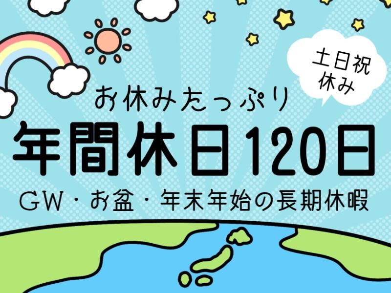休日休暇 土日祝休み(会社カレンダーあり) *年間休日120日 *GW休暇あり *お盆休みあり *年末年始休暇 *慶弔休暇あり *有給休暇(※入社半年後に10日間付与)