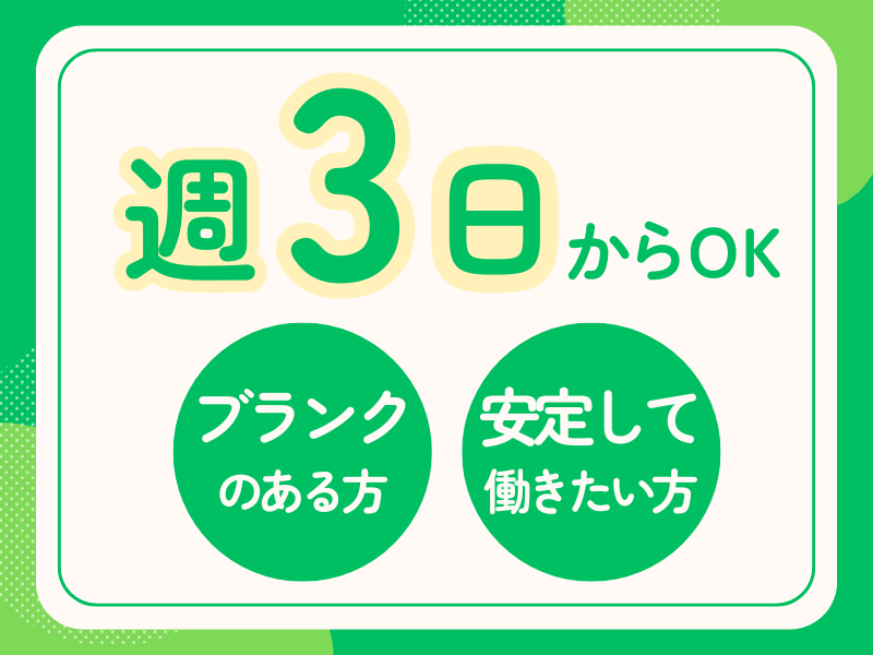 勤務時間詳細 【勤務時間】 ・13:30~17:00 ・13:30~18:00 ・13:30~19:45 【働き方】 ■週3日から勤務可能 ■平日のみの勤務も相談OK ■ライフスタイルに合わせたシフト調整可
