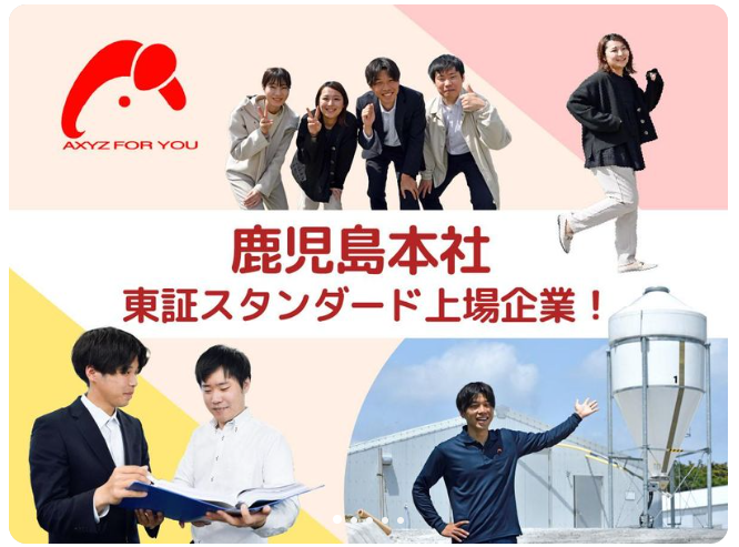 ■応募後の流れ ここまでお読みいただきありがとうございます。 Webまたは電話よりご応募ください。 Webから応募された場合は、後日こちらからご連絡いたします。 【電話でのお問い合わせ】 電話番号:0995-65-9920 受付時間:8:00~17:00 採用担当:採用担当ソノダ 【株式会社アクシーズ(アクシーズグループ)】 鹿児島を拠点に、鶏肉や鶏肉加工食品の製造・販売を手掛けている当社。 飼育から加工、販売までの体制を自社内に整備した『完全なるインテグレーション(一貫生産)』が私たちの最大のこだわりです。 主な取引先はケンタッキーフライドチキン様、ニチレイ様、日本ハム様などの大手企業です。 東京証券取引所に株式上場も果たしており、更なる発展を目指しております。 事業内容:鶏肉およびその加工食品の製造販売 設立:昭和37年11月13日 資本金:4億5,237万円 従業員数(グループ連結) 2025年6月 1,282名 2024年6月 1,320名 2023年6月 1,247名 2022年6月 1,263名 2021年6月 1,303名 売上高(グループ連結) 2025年6月期 264億2,600万円 2024年6月期 258億3,600万円 2023年6月期 241億100万円 2022年6月期 217億2,500万円 2021年6月期 211億6,000万円 事業所本社/鹿児島市 事務所/吉田事務所、串良事務所 工場/帖佐工場、川上工場、宮之城工場、宮之城第2工場、薩摩工場、鹿児島工場 事業所/南栄事業所 子会社: 株式会社アクシーズフーズ(KFC店舗及びピザハット店舗の外食事業) 錦江湾飼料株式会社(当社向けの飼料製造) 株式会社アクシーズケミカル(シラスバルーン・ゼオライト製品および無化学肥料の販売) 株式会社アイエムポートリー(肥育農場の運営) 株式会社南九州畜産 〒890-0014 鹿児島市草牟田二丁目1番8号 TEL: 099-223-7385 担当: 経営企画室 採用担当 E-mail: jinji@axyz-grp.co.jp URL: http://www.axyz-grp.co.jp 【こんな求人をお探しの方にもおすすめ】 ・食品工場、倉庫内作業、工場内作業、現場作業、シール貼り、袋詰め、ライン作業、ピッキング、パッキング、梱包、仕分け、加工などの求人をお探しの方 ・マシンオペレーター、清掃、洗浄、品出し、検査、検品、組立、フォークリフトなどの求人をお探しの方 ・ハローワークでお仕事をお探しの方も歓迎 ■応募受付電話番号 0995-65-9920 ■個人情報の取扱いについて ご提供いただいた個人情報は、採用選考及び結果等の通知・連絡の為に利用いたします。 それ以外の利用目的または法令等に基づく要請の範囲を超えた利用はいたしません。