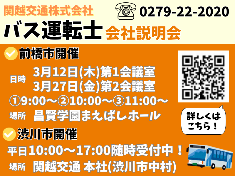 求める人材: 【応募条件】 普通自動車免許(取得1年以上) 配送業、農家、介護職など、、 新人ドライバーのほとんどが異業種 出身です! 50代~のセカンドキャリアも応援します! ▼1つでも当てはまれば活躍できます!▼ ・手に職をつけたい方 ・運転が好きな方 ・安定した業界で働きたい方 ・地元で長く働きたい方 ・子育てが落ち着いて復職をされたい 【歓迎条件】 大型二種免許をお持ちの方 ※第一種自動車免許 (普通、大型、中型、大特など) ※学歴不問(中卒、高卒、大卒OK) ※年齢不問(若手・中高年活躍中、シニア活躍中) ※ブランクOK ※U・Iターン歓迎 ※新卒、第二新卒歓迎 ※男性、女性ともに活躍中 ※20代/30代/40代/50代/60代も活躍中 /////////////////////////////////// 渋川営業所(本社にて) 随時説明会を開催中! ※平日の10:00~17:00 HP:https://kan-etsu.net/pages/126/ 実際のバスを見てから応募したい、、 職場の雰囲気を確認したい!など 見学からでもOK! お気軽にお問い合わせください! TEL:0279-22-2020 ///////////////////////////////////