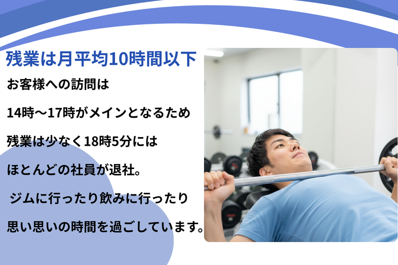 職場環境 営業は20代~40代が活躍中。 役職問わず、気軽に話せるメンバーばかり お客様情報を個人で抱え込まず、 対応履歴など全員で共有しています。 休みの日や急な対応が必要なときも 社内でフォローし合えるため、 無理な働き方になりにくいのが特徴です。
