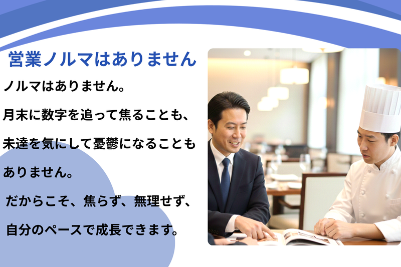 仕事内容 当社は首都圏の高級飲食店向けに、 ユニフォームやテーブルクロスの レンタル・クリーニング事業を展開しています。 ユニフォームは、お店の第一印象となる 「清潔感」「ブランド」を作る重要なアイテム。 私たちはただ商品を届けるだけの「モノ売り」ではなく、 ユニフォームを通してお客様の 『お店のブランディング』や『スタッフの働きやすさ』までサポートする営業です。 ⏩ノルマがないため未達のプレッシャーなし ⏩基本給に上乗せで毎月インセンティブ支給 ⏩インセンティブとは別に賞与もあり ⏩完全週休2日制/年間休日120日! ⏩残業ほぼなし・18時台には退社可能 ◤具体的な仕事内容◢  ̄ ̄ ̄ ̄ ̄ ̄ ̄ ̄ ̄ ̄ 既存顧客のフォローと、新規開拓を並行して担当します。 (※商談等の訪問数は1日1〜2件程度です) ■納品・回収業務(★提案のタネ探し!) クリーニング品の納品・回収は、営業も含め「会社全員」で協力して行います。 現場に足を運んでスタッフさんと顔を合わせることで、 「今の制服、動きにくくて…」といったリアルな声が聞け、 お店の課題に気づくことができます。 ■定期訪問・プラン提案(★営業の本領発揮!) 納品時に拾った現場の声などを活かし、 店長やオーナーへヒアリングと提案を行います。 「着物だと若いバイトが定着しなくて…」といった悩みに対し、 お店のコンセプトに合わせたデザイン変更や、 採用課題の解決に向けたユニフォームのブランディング提案を行います。 (併せて数量増減などの事務対応も行います) ■新規開拓(★あなたの収入UPに直結!) リストへのテレアポ、既存顧客からのご紹介、 お問い合わせへの反響対応などで新しいお客様を開拓します。 「未達だと怒られる」ような短期ノルマはありませんが、 新規開拓は会社の成長とあなたの収入アップのための重要なミッションです。 獲得した分だけ、しっかりインセンティブで還元されます! ◤お客様の課題をこう解決しました◢  ̄ ̄ ̄ ̄ ̄ ̄ ̄ ̄ ̄ ̄ ̄ ̄ ̄ ̄ ̄ ̄ ̄ ✅【採用活動が改善】 和食料理屋の制服を着物型から和風Tシャツへ変更。若い層からの応募が増え、採用課題の解決に繋がりました! ✅【スタッフの時間が生まれた】 お店での洗濯・アイロン業務をゼロに。スタッフの休憩時間が増え、労働環境の改善に貢献しました。 ◤コツコツ継続が「収入アップ」に直結◢  ̄ ̄ ̄ ̄ ̄ ̄ ̄ ̄ ̄ ̄ ̄ ̄ ̄ ̄ ̄ ̄ ̄ 既存顧客の引き継ぎ+新規の積み上げにより、 あなた個人の【月間担当売上が200万円】 を超えた時点から、超過分の5%を毎月インセンティブとして支給します! <達成のイメージ> 当社のレンタル事業は、一度契約すると長く続く「ストック型(積み上げ式)」。 新規を取るたびに売上がリセットされず、毎月蓄積されていくのが特徴です。 単価にもよりますが、コツコツとお客様との信頼を積み重ねていくことで、 入社2年半〜4年目でこの基準をクリアする社員が多いです。 「今月は売上が悪いから給料が下がる」といった歩合制のプレッシャーはなく、 担当売上が積み上がるほどベースの年収が上がっていく安定した仕組みです。 派手さよりも継続 努力が収入に変わる仕組みです。 ◤18時5分には帰宅、残業ほぼなし◢  ̄ ̄ ̄ ̄ ̄ ̄ ̄ ̄ ̄ ̄ ̄ ̄ ̄ ̄ ̄ ̄ ̄ 月平均残業は10時間以内です。 飲食店への訪問は、お店のアイドルタイム(14時~17時)がメイン。 そのため、夕方以降に無理な営業活動を入れることはありません。 18時過ぎには退社し、ジムに行ったり、友人と食事に行ったりと、 みんな思い思いのプライベートを満喫しています!