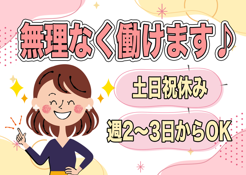 職場環境 週2~3日から勤務OKなので働きやすいと思います。 週5勤務もOKです。 リピート勤務の方が多く、わからない事はみんなで相談しながら進めますので安心してお仕事ができますよ。 駐車場もありますので車通勤できます。 喫煙所:なし(敷地内全て禁煙)