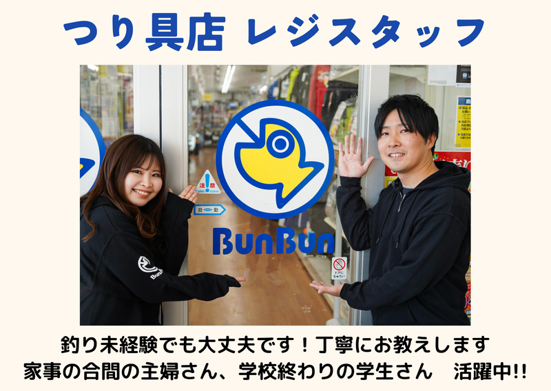 仕事内容 釣り具店にてレジ業務を中心にお任せします。 レジの操作は簡単! 1週間ほどでスムーズに出来るようになりますよ。 開店時にはレジ開け、閉店時にはレジ締め業務もお願いします。 レジ業務がないときは商品の陳列などをお願いします。 ※釣り好きな方、釣り経験のある方は、簡単な接客もお任せいたします。 【希望の働き方が叶う!】 短時間勤務、フルタイムなど都合に合わせて勤務できます! 家庭や学校と両立しているスタッフも多数在籍。 「土日祝のみ」「平日のみ」の勤務もOKです! 【未経験でも大丈夫!】 「釣りやったことないけど」「バイトは初めて」でも大丈夫! 先輩スタッフが丁寧にお教えするのでご安心くださいね!