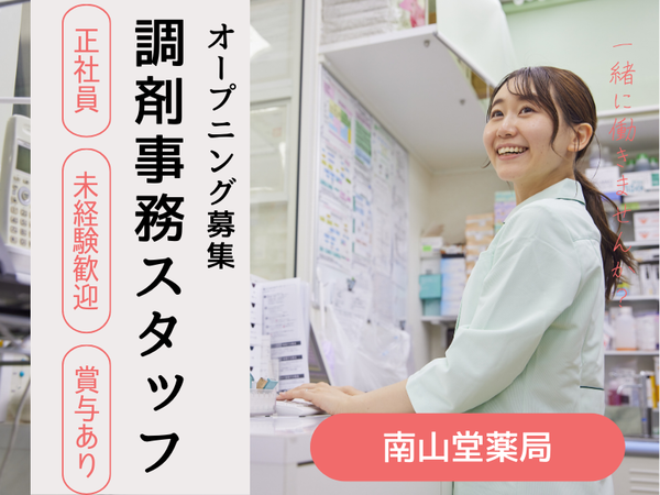 仕事内容 \\ 充実の福利厚生! // ◎年間休日120日! ◎産休育休取得実績多数! ◎週休2日制! ◎賞与年2回&昇給あり! ======================= ~当社のおすすめポイントをご紹介!~ ▶国内に約120店舗の薬局を運営中! ▶未経験・無資格からチャレンジできます! ▶賞与・昇給、日祝出勤の手当など福利厚生も充実◎ ▶お客様と距離が近い!地域密着の薬局です! ======================= \\ 応募は簡単!面接は1回です! // ◎履歴書登録不要! ◎名前・生年月日など簡単な項目を入力するだけ! ◎面接はWEBで1回! ======================= Aさん(30代・女性)/ 株式会社南山堂・調剤事務 子どもが小学校に上がるタイミングで、家庭と両立できる仕事を探して調剤薬局事務に出会いました。最初は「難しいかな?」と思いましたが、無資格・未経験でも始められると知り、思い切って応募!実際働いてみてこの選択は大正解でした。おすすめのポイントを紹介しますね◎ ①残業少なめ&お休み充実! 残業は月平均8時間程度、さらに年間休日120日!家族との時間も大切にでき、子供の参観日や運動会などの日程も調整してくれて、本当に助かっています^^(※店舗により若干異なります) ②資格・経験一切不要! 未経験・無資格OK!基本的なPC操作ができれば問題ありません◎入社直後から店舗でのOJT研修があり、先輩がしっかり丁寧に教えてくれます。慣れるまで店舗全員がいつでもサポートしてくれますので、安心してくださいね。 ③安定した業界で働ける! 医療は生活に欠かせないもの。だからこそ安定して長く続けられる仕事だなと思っています。自分の仕事が薬を必要としている方々に少しでも役立っていると思うと、仕事への誇りも出てきますね! 最初は薬の知識に戸惑うこともありましたが、スタッフのサポートのおかげで自信がつき、今では資格取得を目指して勉強中です!安定して働ける職場で新しい一歩を一緒に踏み出しませんか? <南山堂で働くスタッフを一部 紹介します!> N・Y先生(20代/薬剤師/ピアノが趣味。5歳から弾いています!) 前職は病院の薬剤師として勤めていました。南山堂は患者様との距離が近く、密に取れるのが魅力です。事務さんも他の薬剤師の先生も皆さん優しくて活気がある職場なので働きやすいです!立地の良さもあり、さまざまな病院の処方箋の依頼があるので学ぶことも多いですね。今後は認定薬剤師の資格を取得して、スキルアップしたいと思っています! Tさん(40代/事務員/読書が好き!ミステリー作品などを読んでいます。) 以前は調剤事務やそれ以外の仕事もしていたのですが、南山堂の新規オープンの求人に魅力を感じて入社を決めました!仕事をしていると薬の知識も増えてきて、少しでも人のためになれているのかなと思うこともあり、やりがいを感じています。以前も調剤事務の仕事をしていたのですが、チェーン店で勤務するのは南山堂が初めてなので、会社ならではの業務を把握してきちんと処理していきたいです。 ・・・・・ 仕事内容 ・・・・・ 2025年9月オープンの南山堂薬局 笹塚店にて、 医療事務(調剤事務)業務全般を担当していただきます♪ ■処方箋せん受付業務 ∟店舗の受付にて、患者様から処方せんとお薬手帳の受け取り・患者応対 ■処方せん入力業務(パソコン操作) ∟レセプトコンピュータにて、処方せん内容の入力を行い、患者様にお渡しする薬袋や明細書・領収書・お薬の情報などを出力します。とても優秀なレセコンですので、使い方を覚えてしまえば特段難しいことはございません♪ ※レセコンの操作 基本的には項目に沿って入力するのみです。 PCを使った作業をしたことがあれば、問題ありません。 ■レセプト業務 ∟月ごとに来局された患者様の調剤報酬明細書を国保や社保・労災・事故の場合は保険会社に提出し、患者様のご負担分を除いたお薬代や手数料等を請求します。 ■調剤補助業務 など ∟主に処方せんに記載されたお薬のピッキングを行います。 <直近は未経験スタートが7割!ブランクがあっても丁寧に教えます◎> 今回の募集は無資格・未経験から応募可能!パソコンを使用する業務があるので、データ入力が出来ればどなたでも大歓迎です。直近で入社した方の7割が未経験スタートなので安心して始めてくださいね。もちろん「以前調剤事務をしていた」という方も大歓迎!ブランクがあっても丁寧に教えます◎駅からも近いので通勤しやすく、スーパーなどにも寄れるので夕ご飯の買い物もできますよ。 <入社初日の流れ、研修制度について> ▼OJT研修スタート 〜専任のトレーナーがつき、チェックリストに沿って丁寧にお教えします。 ▼近隣店舗での研修実施の可能性あり 〜状況に応じて配属店舗以外での実地研修を行います。 ▼配属店舗で育成サポート 〜職場に慣れる(約1〜2ヶ月想定)までチームで業務をサポートします。