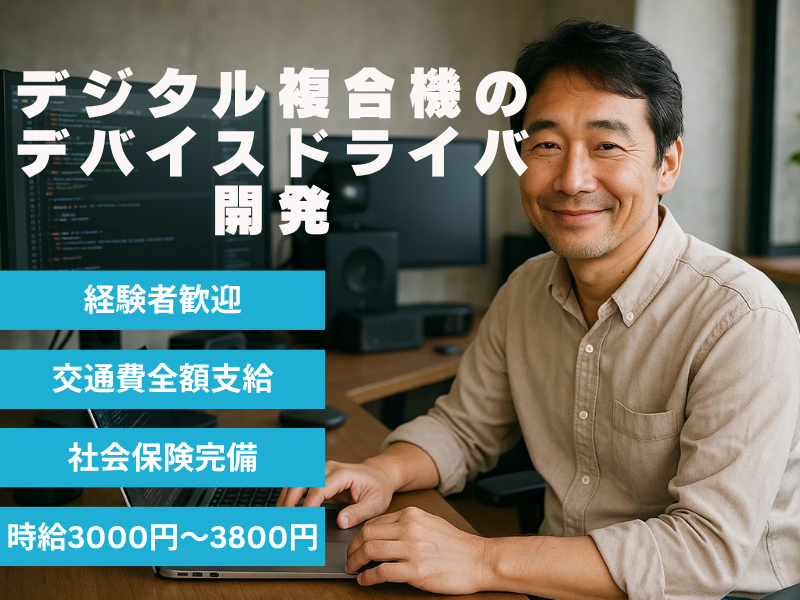 仕事内容 デジタル複合機向け ファームウェア/デバイスドライバ開発 を担当いただきます。 上流設計書をもとに、詳細設計〜実装〜評価まで一連工程に参画いただけます。 ■具体的業務 機能仕様書からの機能抽出 詳細設計書作成 C++(FW)/C(Driver)による実装 マルチスレッド開発 不具合解析・改修対応 新機種開発&既存機種の改善対応 ■開発環境 言語:C / C++ OS:組込みLinux※経験あれば優遇 チーム人数:6名 製品:デジタル複合機