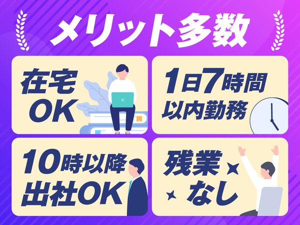 勤務時間 固定時間制 08:40~17:10 08:40~17:10 実働7時間30分 休憩60分 残業は5(時間以内/月)です。