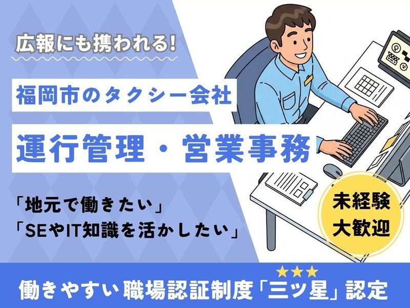 仕事内容 《地元の人から愛されるタクシー会社》 《広報にも携われる運行管理・営業事務》 ◎普免あればOK・未経験OK ◎働きやすい職場認証制度「三ツ星」 ◎有名タクシーアプリを福岡で最初に導入 ◎動画やSNS配信・運用などもアリ ◎落ち着いている当直夜勤からスタート ◎マイカー通勤OK(無料駐車場完備) - タクシー乗務員になるための二種免許取得サポートや、ドライバースタッフのサポート業務・営業事務、広報など内勤メインのお仕事です。 最初は当直員として夜勤から始めていただき、研修期間終了後は営業事務等をメインで日勤となります。 <運行管理業務> ●ネットワークや各種管理画面での対応 ●無線対応 ●お客様からの配車・予約依頼処理 ●事故・トラブル対応 ●ほか電話対応 <営業事務業務> ●給与計算 ●納金作業 ●日報管理(自動日報) ●二種免許取得に関わる各種手続 ●ほか営業補佐 <広報業務> ●動画やSNS配信・運用 ●ほか広報活動 ネットワークやシステムを利用した各種管理や動画サイト・SNSでの広報など、IT関連の知識スキルも活かせるお仕事です。 お仕事は多岐に渡りますが、やりがいも沢山あります! アットホームで質問などもしやすい環境ですので、未経験の方もご安心ください。 得意分野やご経験があれば、新たな挑戦もでき、どんどん活躍していただけますよ! - <タクシーアプリの導入で売上安定> 1000万超ダウンロードされたタクシー配車アプリを福岡で先駆けて導入! アプリ客や予約客をうまくスケジューリングし、安定した業績を上げています。 <働きやすい職場として認定あり> ドライバーの時差勤務体制や21乗務導入などで、働きやすい職場認証「三ツ星」をいただいています。 スタッフみんなが気持ちよく勤務できるよう、社屋の環境整備なども進めています。 <社屋など社内環境も整備推進中> 男女別の更衣室やトイレ等も改装して準備中! 社屋も今後新しくする予定で、電気自動車10台も導入しました。 <和気あいあいとした当社の様子を公開中> ■Instagram「taxi.daiwa」で検索! ■YouTube「福岡市の大和自動車」で検索!