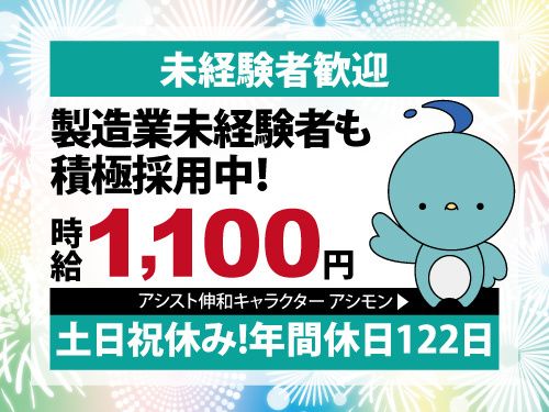 仕事内容 宮城県名取市にある企業にて勤務いただく、 産業用機器の製造するお仕事です。 幅広い年齢層のスタッフ活躍中! 「オススメポイント!」 〇資格や経験は不問! 〇日勤専属で無理なく働ける! 〇嬉しい土日祝休みでプライベートも充実! 〇年間休日122日でたっぷり休める! 〇ご希望により、出張面接もOK! 「主なお仕事内容」 産業用機器の製造をおこなっていただきます。 ・組立 ・検査 ・梱包 ・加工 未経験者の方でも安心の 充実した研修制度もあります。 先輩スタッフが丁寧にサポート! 「このような方へオススメ!」 ・働きやすさを重視したい方! ・日勤専属のお仕事をお探しの方! ・未経験でもチャレンジしたい方! ・モノづくりに興味がある方! 「働きやすさ」で選ぶなら 「アシスト伸和」にお任せください。 他にも多数お仕事がございますので あなたに合ったお仕事探しが可能です。 まずはお気軽にお問い合わせください。