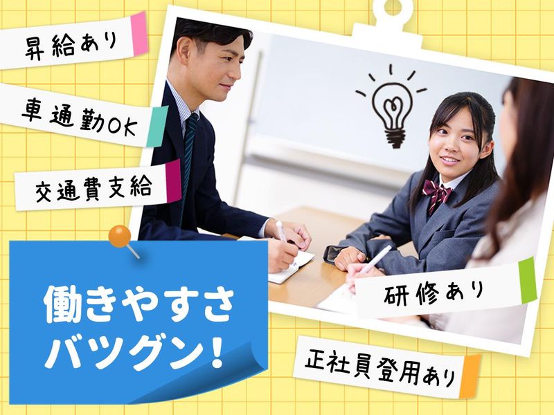 仕事内容 ー ▼CHECK! ー ☆土日祝休みで子育てとの両立も◎ ☆15時~21時の中のシフトで午前中はゆっくり♪ ☆勤務日数・曜日は相談OK ☆正社員登用アリ! ☆交通費全額支給 ー ▼お任せするのは ー 新規入塾希望者の電話受付対応! 「入塾を考えていて……」 といった方からのお電話にご対応いただきます。 人と話すのが好きな方なら、活躍できること間違いナシ! その他、現生徒さんからの各種問合せ対応や簡単な事務作業などをお任せします。 \\未経験でも安心!// 「電話対応ははじめて……」 「塾について知識ゼロ……」 そんな方でも大丈夫◎ 必要な知識は、業務をこなしていくうちに自然と覚えていけますよ! 入社後は本社での研修もご用意しています! ー ▼サクラサクセスって? ー 山陰、関西、九州、東海エリアで小学生から高校生を対象にした個別指導塾を手がける当社。創業から15年で、60校までに成長しました!