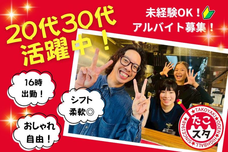 【仕事内容】 ✨このお店の第一歩は“未経験”から。 あなたも一緒に、たこ焼きのプロになってみませんか? 「接客って意外と楽しい」「たこ焼き、最初は不安だったけど意外と焼けた!」 そんな声が飛び交う、アットホームなお店です! たこスタでは、20~30代の仲間が元気に活躍中! バイトデビューの方も、安心してスタートできます⭕️ ⏩仕事内容 ・お客様のご案内 ・オーダー対応 ・料理やドリンクの提供 ・レジ業務 など 店舗スタッフとして、ホールやキッチンのサポートをお願いします。 接客の仕方、レジの操作方法など丁寧にレクチャーしますので未経験の方でもご安心ください! 居酒屋だからメニュー数が多すぎて覚えきれない…といった心配は不要です! 未経験の方やブランクがある方でも、スムーズに仕事を覚えられる環境が整っています✨ ================== ✅たこ焼きも接客も、楽しく身につく! ================== 「丸く焼けると気持ちいい!」という声が続出のたこ焼きづくり。 実はコツをつかめば簡単で、ちょっとした特技にもなっちゃいます! 接客や調理が初めてでも大丈夫。 20〜30代のスタッフが中心となって、チームでしっかりフォローします! 「人と話すのが好き」「元気に挨拶できる」——そんな方なら、きっと楽しめます! ==================== ✅シフトは柔軟対応!自分のペースで働ける! ==================== 授業やサークル、Wワーク、家事との両立もバッチリ! 「この曜日だけ」「この時間だけ」など、ライフスタイルに合わせて無理なく働けます。 夕方~夜の時間帯でサクッとお小遣い稼ぎしたい方にもピッタリ! たこスタなら、あなたらしい働き方がきっと見つかります✨ =============== ✅あったかいチームで働ける! =============== スタッフ皆で想いを共有しながら、一緒にお店をつくっていくあたたかい職場です。 困ったときはすぐに相談できる、安心して働ける雰囲気があるのも魅力のひとつ✨ 助け合いながら、少しずつ成長していける環境です。 【求人ID-OCT】