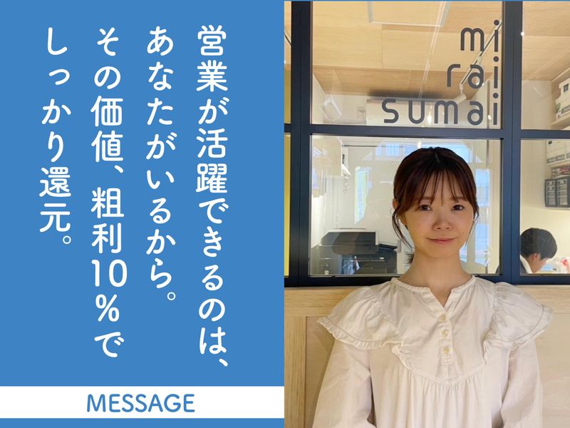 選考プロセス エントリー ▼ 書類選考 ※通過された方に 面接日などのご連絡いたします。 ▼ 一次選考(社長とのWEB面接) ※面接日時はご希望を考慮します。 ◎面接はお見合いの場だと思って 何でも遠慮なく聞いてください。 ▼ 二次選考(メンバーとお食事) フィーリングを確認する場です。 ▼ 内定 ※入社日は相談に応じます。 【HP】 https://www.miraisumai.com/