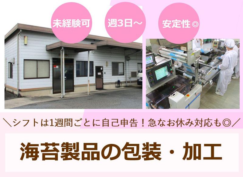 仕事内容 ✨扶養内で長期的に安定して働ける♪ ✨シフト融通◎急なお休み対応も可! ✨経験・知識は一切必要なし★ |◤ お仕事内容 ◢|  ̄ ̄ ̄ ̄ ̄ ̄ ̄ ̄ ̄ ̄ ̄ ̄ ̄ ̄ ̄ ̄ ̄ ̄ ̄ 海苔製品の包装・加工作業をお任せします 簡単な機械操作も行っていただきます。 基本的には5名程度のチームで作業を行い 流れ作業で効率よく製品を仕上げていきま す。 具体的には… ✅コンベアから流れてくる製品の包装作業 や海苔の加工作業 ✅簡単な機械操作 ✅品質チェック 未経験の方でも先輩スタッフが丁寧に指導 しますので、安心してスタートできます。 ⭐働きやすい環境づくり⭐  ̄ ̄ ̄ ̄ ̄ ̄ ̄ ̄ ̄ ̄ ̄ ̄ ̄ ̄ ̄ ̄ ̄ ̄ ̄ 当社では、スタッフの皆さんが働きやすい 環境づくりに力を入れています。 シフトは事前申告制★ 毎週木曜日に次の週の1週間分の休み希望 を出していただき、それに合わせて次週の シフトを組んでいます。 1週間毎のシフト制なので、 ご自身の都合に合わせて働きやすい♪ 家庭の都合にも柔軟に対応! また、当日のお休みや1日勤務予定だった ものを半日に変更するなどの急な対応も 可能な限り受け付けています! プライベートと両立しながら 無理なく働ける環境を整えていますので、 ぜひお気軽にご応募ください。 ⭐当社について⭐  ̄ ̄ ̄ ̄ ̄ ̄ ̄ ̄ ̄ ̄ ̄ ̄ ̄ ̄ ̄ ̄ ̄ ̄ ̄ 当社は栃木県宇都宮市に拠点を置き、 海苔製品を製造・販売している会社です。 長年培ってきた技術と品質へのこだわりで 多くのお客様からご支持をいただいており ます。