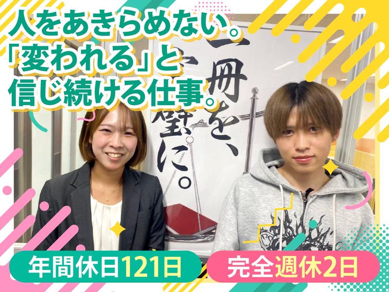 仕事内容 ■ 年間休日121日★完全週休2日 ■ 未経験入社の20代30代社員も多数 ■ ほぼ定時出勤・定時退社しています ■ 服装自由!ビジネスカジュアルOK◎ ■ 常識や型にハマらない教育を! - たった一人の先生との出会いで、 人生が変わることがある。 ずっと諦めずにいてくれた。 先生のひと言に背中を押された。 一人もがいていたとき、 弱い自分や周りの声に流されかけたとき、 自分に向き合い続けてくれた。 もしあなたにそんな先生がいたなら。 その先に叶えた未来があるなら。 教員免許も先生の経験も必要ない。 変わるきっかけを与え続ける。 諦めずに向き合い続ける。 変われると信じ続ける。 それをできるあなたと、 私たちは一緒に働きたい。 生徒自身が自分で変われるように、 「信じて向き合う」仕事を 始めてみませんか? ▼▼ こんな方も大歓迎です ▼▼ - ■ 塾業界・教育業界は完全未経験 ■ 教育学部は出ていない ■ 教員免許なし ■ 大学中退している 大学受験の経験さえあれば、 ぜひ面接でお会いしたいです。 というのも、 私たちが見ているのは、 「学歴よりも人間力」。 何か1つのことを本気でやった経験。 成功体験だけでなく、挫折や苦労、失敗、 劣等感…苦しさを乗り越えてきた経験が 教育の現場では役立つことが たくさんあります。 業界の常識にとらわれず、 型にはまらず、 生徒のために熱くなれる方を お待ちしています! ▼▼ 今回の募集は…▼▼ 「授業をしない塾」で有名な、 武田塾での勤務です。 ★ 生徒の自学自習力を伸ばす塾 ★「わかる」⇒「できる」を徹底! ★ 完璧になるまで絶対先に進まない! 志望校や一人ひとりの学力に応じて ゴールから逆算し、 一年分のカリキュラムを作成。 一週間の宿題を一日毎に設定、 その確認テストを塾で毎週実施。 不合格なら翌週も同範囲を再テスト。 参考書を一冊ずつ完璧にします。 つまり、 「自分でやる」「できるようになる」 を徹底的にサポートするスタイル。 「わかった気になっただけ」 「やりっぱなし・解きっぱなし」 を根本から変える勉強法で 生徒の成長を支えてみませんか? ※詳細は下記URLをご覧ください。 https://www.takeda.tv/about/ ―――――【お仕事内容】――――― 武田塾での教室運営・個別指導の お仕事です。 ■教室の売上管理 ■備品・教材の発注管理 ■生徒募集に向けた広報・企画立案 ■講師スタッフの管理、採用面接 ■学習カリキュラムの作成・調整 ■生徒との個別面談/学習状況のヒアリング ■保護者へのフォロー連絡 ■イベントの企画・準備 など ◎基本的な学習指導は講師が担当! 必要に応じて得意科目の 指導をお任せすることもあります。 ◎一人ひとりに最適な指導を行えます。 ◎ビジネスカジュアルなら服装自由! ⇒スーツを着る必要ナシ! ⇒ジャケットを着てTシャツ勤務も多数◎ ――Tsyatu は】――――― 1~3ヵ月かけて研修を行います。 ▼STEP1 武田塾の本部研修 - ・武田塾の考え方 ・武田塾の勉強法 ・受験相談のロープレ (武田塾の説明の仕方等) ・研修内容のテスト など ▼STEP2 当社の研修 - ・受験相談のロープレ ・先輩社員と同席で受験相談対応 ・基本的な教室運営業務からスタート ⇒生徒の時間割と講師のシフト確認等、 かんたんな業務からお教えします! ▼STEP3 配属校でひとり立ち - ひとり立ち後もメンターの先輩社員に 気軽に相談できる体制! 現社員も毎日連絡を取り合って 生徒の指導や保護者対応など 何でも相談しています◎ / 日本教育設計HOGグループ ってどんな会社? \ “ヒトを笑顔に”という理念を掲げ、 教育事業を軸に福祉事業まで展開。 教育の個別最適化に加え、 障害福祉サービス、リスキリング といった子どもから障がいのある方、 そして大人まで、すべての人の学びを支える 「教育の総合機関」を目指しています。 / 年間休日121日! 完全週休2日。 有給もとりやすい。 \ 基本的に早出や残業ほぼなし。 社員も「ライブ行きます!」 と気軽に有給を使っていますし、 休日に電話対応の必要もありません。 塾業界経験者にはよく驚かれますが、 本当です(笑) あなたがお休みの日は、 事務スタッフや講師、他社員が 対応する体制ができています。 生徒を笑顔にするには、 まずは先生が笑顔じゃないと。 そんな考え方を根底に、 働く社員のための環境づくりにも、 本気の会社です。 ||◤この求人を見ているあなたへ ―――――――――――――――― 少子化が進み、従来の学習塾という 枠組みだけでは生き残れない時代が 到来しています。 しかし、どんな時代でも、 “ヒトを笑顔に”という 私たちの理念は変わりません。 私たちが進めるのは、 教育の個別最適化に加え、 放課後等デイサービスによる 療育等の障害福祉サービス、 そしてリスキリングといった 大人の学びも応援できる展開。 " 教育 " を通してより多くの人と関わり、 関わるすべての人を笑顔にする。 その先に、当社の未来はあります。 だからこそ、 周りの人を笑顔にできる、 周りの人を笑顔にし