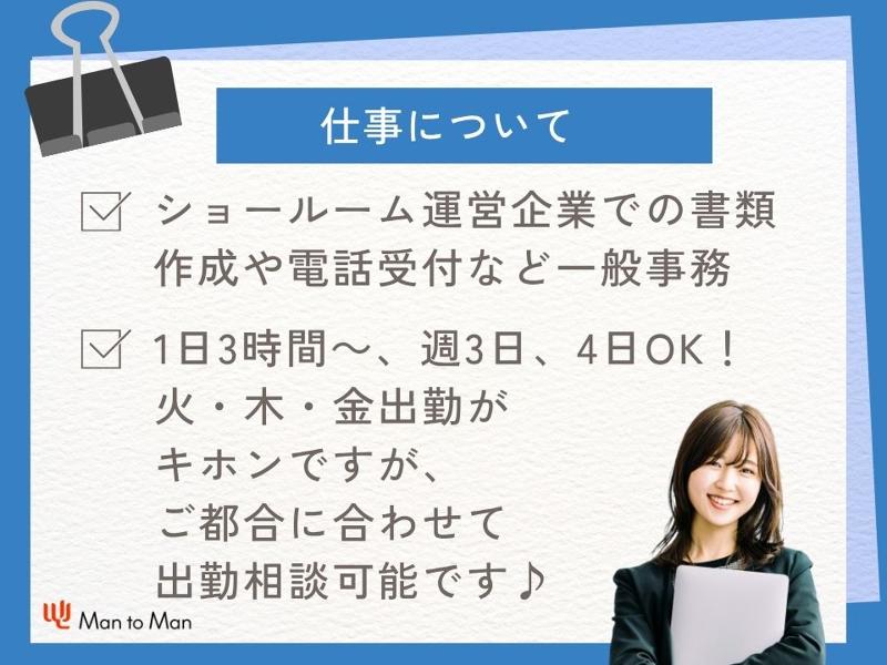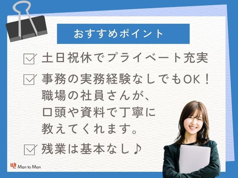 求める人材: 【応募資格】 未経験OK/ブランクOK 特別な知識・スキルは一切不要です。 入社後、職場で丁寧に教えていただける ので、事務職の経験がない方でも 大丈夫です。 Man to Manには、 ハローワークや一般求人誌には掲載されて いないお仕事情報もたくさんありますので、 まずはお気軽にお問合せください。