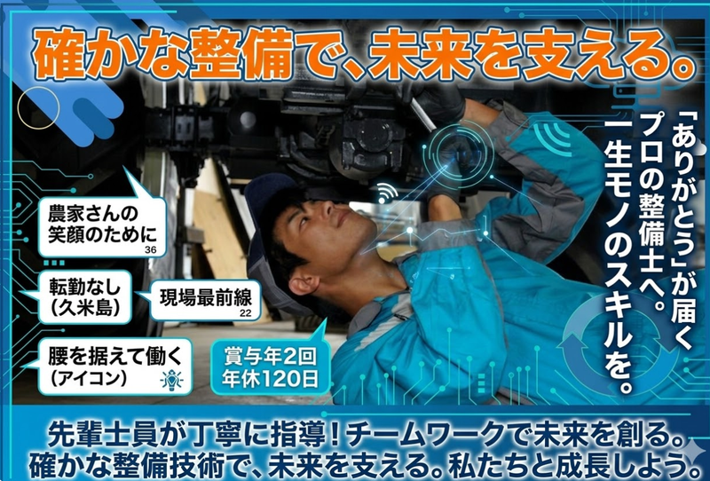 求めている人材 【必須条件】 ✅普通自動車第一種運転免許(MT限定) └ 業務でMT車(軽トラック)を使用します ✅ 高校卒業以上 ・‥…━━━━━━━…‥・ \こんな方歓迎!/ ✨8トン限定中型自動車免許をお持ちの方 ✨機械を触ることが好きな方 ✨人と話すことが好きな方 ✨自動車やバイクをご自身で メンテナンスするのが好きな方 ✨AIや自動運転、ドローンなど 最新テクノロジーに触れてみたい方 ✨法人・個人営業の経験がある方 └ 農業機械の知識は不問です ✨長期的に腰を据えて働きたい方 ✨南九州・沖縄ゆかりの地で 日本の食を支えたい方に ぴったりのポジションです◎ *農業機械に関する専門知識や 整備士資格は入社時点では 一切問いません。 社員の大半が未経験からスタートし、 入社後の定期的な農業機械の基礎研修で スキルを身につけられます◎ *車やバイクのカスタマイズが 趣味の方は、その知見を 直接業務に活かすことができ、 参入障壁は思いのほか低いです。 *他業界での営業経験をお持ちの方は、 傾聴力やコミュニケーションスキルが 現場での信頼構築において 即戦力として高く評価されます。 「困っている農家を放っておけない」 「地域農業の根幹を泥臭く支えたい」 そんな使命感をお持ちの方を 心から歓迎いたします! 年齢の条件と理由:あり(例外事由1号・60歳未満(定年のため))