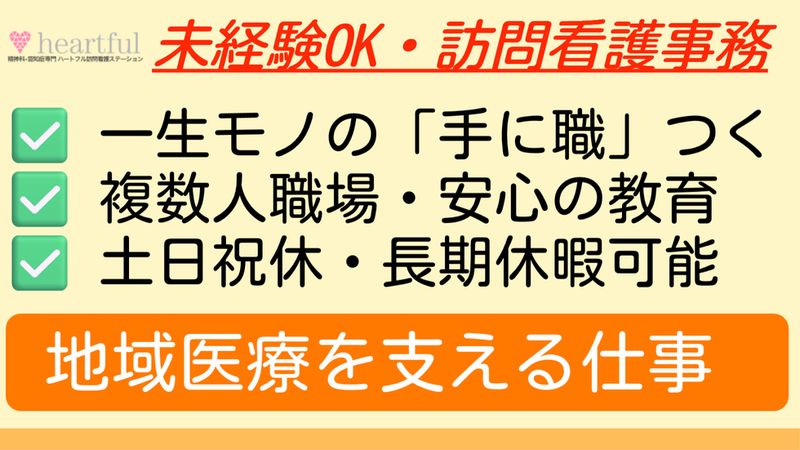 企業のセールスポイント ハートフルってどんなところ?なんで入社したの? 【本音】匿名アンケート結果を大公開! Q:どこから会社に通ってますか? ・東京都目黒区です。 ・東京都板橋区です。 ・東京都大田区からです。 ・東京都世田谷区です。 ・東京都内です。 ・神奈川県川崎市から通っています。 ・埼玉県朝霞市です。 ・川崎市高津区からです。 Q:前は、どんな仕事をされてきましたか? ・前職も精神科訪問看護、それ以前は総合病院の精神科、児童精神科、内科で看護師をしていました。 ・精神科病院、介護老人保健施設です。 ・精神科単科の病院の作業療法士。病棟担当です。 ・精神科の訪問看護です。 ・クリニックの医療事務で働いていました。 ・精神科病棟看護師、心臓血管外科、神経内科、循環器科の混合病棟勤務、産婦人科病棟で勤務していました。 ・精神科の病院にて、院内の作業療法、地域の訪問看護です。 ・精神科病棟の看護師、訪問看護師です。 ・医療事務 接客業です。 ・精神科病棟の看護師、難病病棟の看護師です。 ・精神科病院、有料老人ホームです。 ・地域の療育施設で療育、家族支援をしていました。 ・訪問看護ステーションでの医療・介護事務、営業事務、アパレル販売、企画などの仕事です。 ・養護教諭です。 ・入院外来医療、在宅医療(精神科以外)です。 ・大学病院の産科看護師、訪問看護です。 ・精神科病棟での勤務です。 ・精神科病院作業療法士です。 ・一般病院の療養・回復期病棟OT、精神科病院OT、精神科デイケアOT、重度認知症対応デイケアOT、精神科訪問看護OTです。 ・精神科病棟の看護師です。 ・精神科病院の作業療法士です。 ・混合病棟、心療内科病棟です。 ・クリニックで医療事務・飲食で働いていました。 ・訪問看護です。 ・大学病院の耳鼻科・脳卒中科、循環器糖尿病内科の看護師、大学の看護学科の教員(基礎看護)。 ・精神科病院勤務です。 Q:入社の「決め手」は? ・支援の方向性、スタンスが明確で体系的な学びにつなげられるのではという期待があったため。 ・通勤30分圏内、6時間勤務可、精神科看護、教育体制がある、未経験可 の条件が揃っていたところがハートフルのみでったため。 ・ホームページに掲載されている紹介内容と自分のやりたい事が合致していたため。 ・自宅から近かったことです。 ・雰囲気が良かった。精神科がやりたかったため。 ・精神科訪問看護がやりたかったため。 ・三次面談まであり、丁寧に評価していただいたこと。 ・友人からの紹介だったこと、働きやすい雰囲気だったこと ・ホームページの内容が良かった。心理士の方が勤務されていた。 ・精神科訪問看護で、作業療法士を積極的に採用していたこと。 ・精神科訪問看護で作業療法士が働ける。アットホームな雰囲気。 ・知っている方が働いているので安心したため。 ・スタッフの人柄、通勤時間です。 ・社長の紹介で、人手が足りないとの事でお力になれたらと思い決めました。 ・面接時、事務所にいたスタッフの方が皆さん、気持ち良く挨拶をしてくれたため。 ・女性が多い職場。子育てしながら働かれている方がいる、働ける環境がある。 ・精神科訪問看護を専門としていたこと。 ・精神科看護のイメージが変わった、教育体制がしっかりしているため。 ・精神疾患を持つ方の退院後の支援ができるから ・HPのスタッフのコメントで育休から復帰されている方がいらっしゃるので、戻ってきたいと思える働きやすい職場環境という印象。 ・スタッフの方の意識が高いと思ったから。 ・病棟ではなく障害を持った方々が地域で暮らせる支援をしたかったから。 ・二次面談時の印象が良かった。 ・2次試験で朝礼に参加させて頂き、向上心のある方が多いと感じたこと ・精神科の経験が活かせそうだったから。 ・給料がそこそこ高い、スタッフが多いから。 ・スタッフ間の連携です。 ・精神科病院で勤務していたが古い体質、体制で、医師、看護師の考えも古い感じの所があり、在宅での訪問看護師として1から色々と学びたいという思いと、自分の時間も少し大切にしたいと思いで夜勤もなく、訪問看護で働いているスタッフの言葉や志しを見聞きして、パソコンやiPadは苦手ですが、フォローしますと言われ、みなさん素敵でチャレンジしてみたいと思ったため。 ・土日祝日休み、教育体制がしっかりしていそうだから。 ・他職種が在籍しておりチーム力を感じたため。 Q:職場の良い所は? ・尊敬出来る人達に囲まれて仕事が出来る。有休が取りやすいところ。 ・チームワークが良いため残業がほぼなく、プライベートの時間も取りやすいところ。 ・職種の垣根があまりない。良いと思ったことは実践できる環境。 ・働きたい時間・曜日など相談し対応してもらえる。成長のために、向上心高く取り組むことを組織として設定し取り組んでいる。 ・人間関係で揉めないところ。 ・職種が違ってもお互いに協力しあえているところ。 ・スタッフ