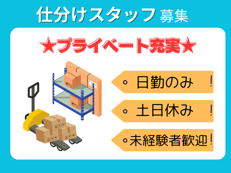 仕事内容 ✅未経験OK!簡単な軽作業のみ ✅日勤のみで生活リズム安定 ✅軽いものが多いので体力負担少なめ ✅モクモク作業が中心 大手倉庫内での商品を取り出したり、まとめたりする作業です。 出荷伝票に基づいて、棚などから商品を出したりしまったりするだけ。 軽い小物が主流ですので重労働ではありません! また倉庫といっても快適でとてもきれいな職場です。。 ブランクのある方も安心して働けます。 作業の手順はマニュアルでしっかり決まっているので、 その通りにやっていくだけ。 難しい作業は一切ありません。 「私にできるかな…」と不安な方も安心して下さい。 ほとんどのスタッフが未経験からスタート。 2~3週間ほどで1人で黙々と進められるようになります。 体力に自信がなくても安心して続けられますよ。 あなたも無理なくスタートできます。 <⭐軽いものだから体への負担少なめ> 扱うのは重たいものが少なく、負担が少なめ。 体力に自信がない方や、 久々のお仕事復帰という方にもぴったり。 現在も未経験スタートの方が多く、 40代までのスタッフが多数活躍中です。 <⭐マニュアル完備!シンプル作業> 業務内容は、マニュアルに沿ってするだけ。 難しい手順や複雑な操作は一切ありません。 1か月あれば充分に習得可能です。 <⭐日勤のみで生活リズム安定> 勤務時間は8:30~17:30の昼勤固定。 夜勤や交替制ではないので、 生活リズムも崩れません。 休日は週休2日(土日)+長期休暇あり。 ご家族との時間やプライベートも 大切にしながら働けます。 <⭐車通勤OK&通勤ラクラク> マイカー通勤が可能なので、 雨の日でも通勤ストレスなし。 駐車場完備&交通費支給(規定あり)で、 通勤コストも抑えられます。 <⭐未経験・ブランク歓迎の安心環境> 工場・製造・物流の経験がある方はもちろん、 未経験の方やブランクがある方も大歓迎。 「モクモク作業が好き」 「正社員経験はないけど安定して働きたい」 そんな気持ちがあればOKです。 前職も学歴も問いません。