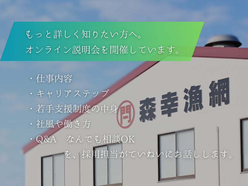 仕事内容 \ ✨未経験から“手に職”で安定を✨ / ❖ 経験ゼロから“技術を持つ人”へ ❖ 「学歴や職歴に自信がない…」 「人と話す仕事は少し苦手…」 「コツコツ働いて安定した生活を送りたい」 ▶▶ そんな方にこそ来てほしい仕事です。 必要なのは“真面目に取り組む気持ち”だけ。 日本の漁業を支える職人技を、 ゼロから丁寧にお教えします。 会話の多さよりも、 手を動かしてコツコツ作業することが得意な方にピッタリ。 未経験からスタートして、 安定した未来を一緒に築きませんか? ■━━━━━━━━━━━━━━━■ 働きやすさも、しっかり整っています! ■━━━━━━━━━━━━━━━■ ⏩ 未経験でも安心の育成体制 先輩のほとんどが未経験スタート! 道具の名前から一つひとつ丁寧に教えます。 ⏩ 「手に職」+資格取得もサポート フォークリフト・クレーンなど 必要な資格は会社負担で取得可能! ⏩ 毎月安定した収入 「生活が安定した」と感じるスタッフ多数。 昇給制度もあり、やりがいも十分◎ ⏩ 長く働ける福利厚生 退職金制度・育休制度・アニバーサリー休暇など、 将来を見据えて働ける環境です。 ‥━━━━━━━━━━━━━━━━━‥ 【仕事内容】 漁で使う網やロープを、使用状況や 漁法に合わせて、メンテナンスを行います。 一つひとつ異なる状態に向き合う、 技術と丁寧さが活きる仕事です。 ▼具体的には…▼ ✅網のメンテナンス加工 ・使い終わった網を修理・補強 ・破れた部分を丁寧に修繕する作業 ・環境にも漁師さんにも役立つ職人技 …………<選べる勤務地>………… 波崎工場(茨城県)/銚子本社(千葉県) 地元で腰を据えて働きたい方に◎ U・Iターンも大歓迎です! ┏━━━━━━━━━━━━━┓ 森幸漁網ってどんな会社? ┗━━━━━━━━━━━━━┛ 創業120年以上の歴史ある企業。 全国の漁業を支える漁網や資材の製造・販売を行っています。 若手からベテランまで幅広く活躍中。 熟練の技術を次世代へ受け継ぐため、 人材育成にも力を入れています。 地元に根差した安定企業で、 長く安心して働ける環境です。