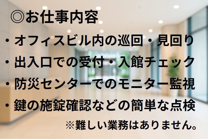 仕事内容 【~小さな変化を拾って、大きな安心につなげる~】 *.゜☆秋葉原駅 徒歩3分のオフィスビル 防災センターのお仕事☆゜.* ☆モニター監視、異常が発生した際の現場確認・連絡業務 ☆定期巡回による安全確認 ☆出入口での来訪者対応 ◇生活リズム安定志向の方、必見!施設警備なら規則正しい安定勤務が出来ちゃいます☆ ◇適度に身体も動かせるので健康にも◎ ◇現場は毎日稼働しているので、週2~マイペース勤務も、週5のガッツリ勤務も安定して可能! ◇未経験者歓迎!未経験から弊社で警備を始めた方はなんと約9割! 【お仕事のやりがい】 ◇安心を提供する喜び 建物の安全を見守ることで、利用者が何事もなく過ごせる環境を支えています! 自分の働きが“日常の安心”につながっていると実感できる、静かな達成感のあるお仕事です☆ ◇屋内で快適に働ける環境 施設警備は屋内業務が中心のため、天候や気温に左右されずに働けます♪ 空調の整った環境で、落ち着いて業務に集中できるのも大きな魅力です! ◇人と接する力が自然と育つ 受付対応や入館手続きなど、さまざまな人と関わる場面が多い仕事です。 丁寧な対応を重ねるうちに、相手に安心感を与えるコミュニケーション力が身につきます! 【こんなあなた、お待ちしております】 ◇週2日から無理なく働きたい ◇週5日で働きたい ◇家計の足しに無理なく ◇定年後の第二の職業として