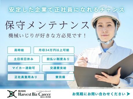 仕事内容 具体的には 機械の保守メンテンナンスのお仕事です! ものづくりには必須の生産設備! その搬送機械などの保守やメンテナンスを行って頂く ドライバーやレンチなどで機械をばらしたり、取り付けたりそんなお仕事です! ・機械の保守メンテナンス ・不具合の解消 ・点検結果の入力等 自動車の整備工場などでお仕事をされてた経験がある方是非ご応募ください♪ ※お電話での業務説明会もございますので、ご自宅にいながらご参加頂けます◎