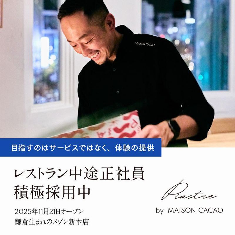 仕事内容 / 《2025年11月21日 New Open!》 \ ✼••┈┈┈┈┈┈┈┈┈┈┈┈┈┈••✼ 「売れる」ブランドではなく 「選ばれる」ブランドに 目指すのは、世界に誇れる100年ブランド 最高峰のサービスを追求する舞台がここにあります 未経験の方、大歓迎! ✼••┈┈┈┈┈┈┈┈┈┈┈┈┈┈••✼ カカオブランド『MAISON CACAO』が運営するスパニッシュメキシカンレストランにて、サービス業務を中心にお任せします。 【具体的なお仕事内容】 ■接客を通じたブランド紹介・製品紹介 ■店舗ブランディング ■ドリンクとチョコレートのペアリング提案 ━━━━━━━━━━━ 鎌倉・若宮大路に、 新たな本店が誕生♪ ━━━━━━━━━━━ ブランド誕生から10年。歴史と文化が息づく鎌倉・若宮大路に、新たな本店がオープン! 舞台は白亜の三階建て洋館。各フロアが持つ独自の個性により、一つの店舗で世界観を表現しています。 ★1F アトリエキッチンフロア ショコラティエが目の前で手掛ける、タルト、エクレア、プリン。本店限定の新作から季節・週替わりの特別なスイーツまで、30品以上の新しい味わいが日々生まれています。 - ★2F コレクションフロア メゾンの代表作と限定コレクションが織りなす、美術館のような空間。アートとショコラが調和する中で、ブランドに込められた想いと物語を、お客様の心にお届けします。 - ★3F カフェ&バー&レストラン 10年の歳月をかけて築いた、日本各地の農家との絆。彼らが愛情込めて育てた素材と、チョコレートが奏でる新しいハーモニー。季節の移ろいを味わいで表現する、特別なダイニング体験をご提供します。 ━━━━━━━━━━━ 今回ご活躍いただく舞台について ━━━━━━━━━━━ 3Fフロアにおいて、ランチ・カフェタイムはメゾンカカオカフェとしてチョコレートやハーブティーなどをご提供。 そしてディナータイムになると、同じ空間が「PIASTRE(ピアストル)」へと変貌を遂げます。ここが、今回のあなたの舞台です。 上質なサービスへの情熱と、お客様一人ひとりに寄り添う心を持った方、大歓迎! ━━━━━━━━━━━ メゾンカカオのはじまり ━━━━━━━━━━━ 私たちのはじまりは2015年。鎌倉の小町通りがスタートです。 小町通りといえば和菓子食べ歩きのイメージが強いですよね。「チョコレートなんて流行らない」そんな風に言われたこともありました。 それでも代表の石原は「文化創造をするブランドだから、日本の文化都市で始めたい。」 そんな熱い想いのもと、伝統を受け継ぎながらも革新が息づく街として鎌倉を選びました。 「日常で上質なチョコレートを楽しむ」そんな新しい文化を創るために、武士のチャレンジ精神を持ってやりたい、そんな想いから誕生しました。 ━━━━━━━━━━━ 明確な給与体系を整備 ━━━━━━━━━━━ あなたのご希望と適性に合わせて、将来はハイプレーヤーの道も、店長の道も選べます。 半年に一度行われる評価面談で目標をすり合わせ、納得度の高い評価・目標設定を行なっています。 トレーニング:研修中 ▼ プレーヤー:業務を1人で遂行できる ▼ モデル:店舗の模範として活躍できる ▼ スーパーモデル:会社全体の模範として活躍できる ▼ クリエイター:事業創造できる(対象:店長以上)