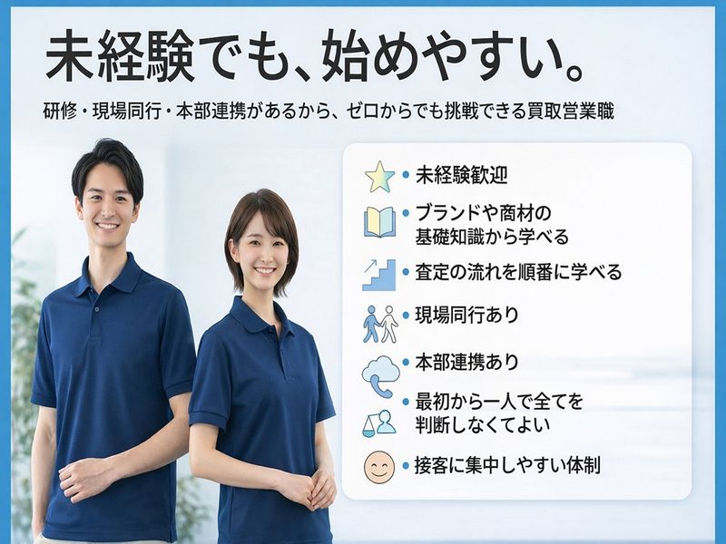 仕事内容: ┏━✨ご応募・お問合せ方法✨━┓ ◆「応募」ボタンよりWeb応募 ※「2分」で応募完了 ※簡単な項目のみ ※履歴書不要 ※面接1回のみ ┗━━━━━━━━━━━━━━┛ . . ________ 未経験歓迎! 丁寧な研修制度あり  ̄ ̄Ⅴ ̄ ̄ ̄ ̄ ̄ ̄ 先輩スタッフの90%が未経験からのスタート! 他業界出身者も活躍中です♪ . 買取、査定経験だけでなく、 営業経験や接客経験がない方も大歓迎です。 研修制度に加え、サポート体制、マニュアル制度も整えております。 . . . ______ 還元率が高い 高収入求人!  ̄ ̄Ⅴ ̄ ̄ ̄ 売上によってはインセンティブで 月100~200万円以上稼ぐスタッフもおり、 未経験スタートのスタッフのうち、 60%以上が年収1,000万円以上稼いでおります! . もしなかなか売上が出ない場合でも、 最低給与保証として毎月30万円支給しております◎ . . . _________________ 催事エリア(勤務エリア)は応相談、 直行直帰もOKで、プライベート重視!  ̄ ̄Ⅴ ̄ ̄ ̄ ̄ ̄ ̄ ̄ ̄ ̄ ̄ ̄ ̄ ̄ ̄ 催事エリアは、 ご自宅から通いやすいエリアからお任せいたします。 . また、基本は直行直帰なので、 自分のペースで無理なく働けます。 ※趣味やご家庭など、ライフスタイルも重視できる環境です。 . . . 【仕事内容】 ブランド品や貴金属の買取スタッフをご担当いただきます。 (買取査定スタッフ、買取鑑定スタッフ、催事買取スタッフ) . <業務の流れ> ①スーパーや商業施設に設けられたブースで お客様に「査定だけでもしてみませんか?」とお声がけ ▼ ②お客様の商品(ブランド品や貴金属)の状態をチェック ▼ ③鑑定結果、買取価格をお伝え ▼ ④買取決定 ※催事(ブース出店)は、 基本2〜3名体制で、1日の対応数は10件程度です。 . . ⭐️当社側が買い取る形なので、 ”長く使っていない” ”もう捨てようと思っていた” というお客様が多く、買取決定しやすい環境です。 ※わからないことがある時はすぐ先輩スタッフに電話で相談できます。 . . . ✅入社後は、、、  ̄ ̄Ⅴ ̄ ̄ ̄ ̄ まずは1~2週間かけて仕事の流れや鑑定時のポイントなど、 未経験の方でも活躍できるよう丁寧に研修を行います。 . 先輩スタッフがどんな質問にもお答えしますので 一つずつあなたのペースに合わせて覚えていただけたらOKです♪ . . ✅職場の環境  ̄ ̄Ⅴ ̄ ̄ ̄ ̄ 経験者だけでなく、 他業種出身のスタッフも活躍中です。 . また、基本は1人か少人数での業務なので、 人間関係のストレスもなく自由に働ける環境です♪