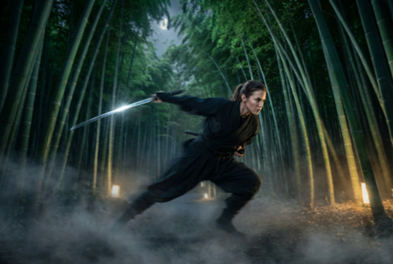 嵐山の夜。本物の忍装束。映画品質のライティング。 ただの記録係ではなく、光と影を操る「演出家」として、あなたの技術を貸してください。